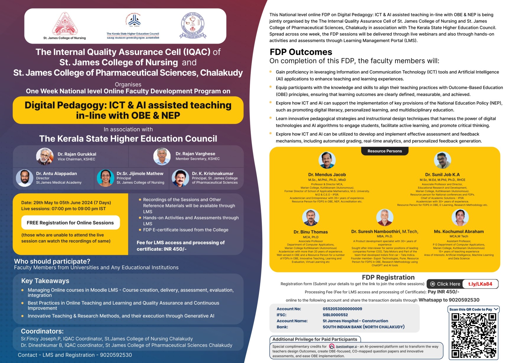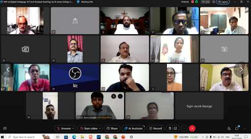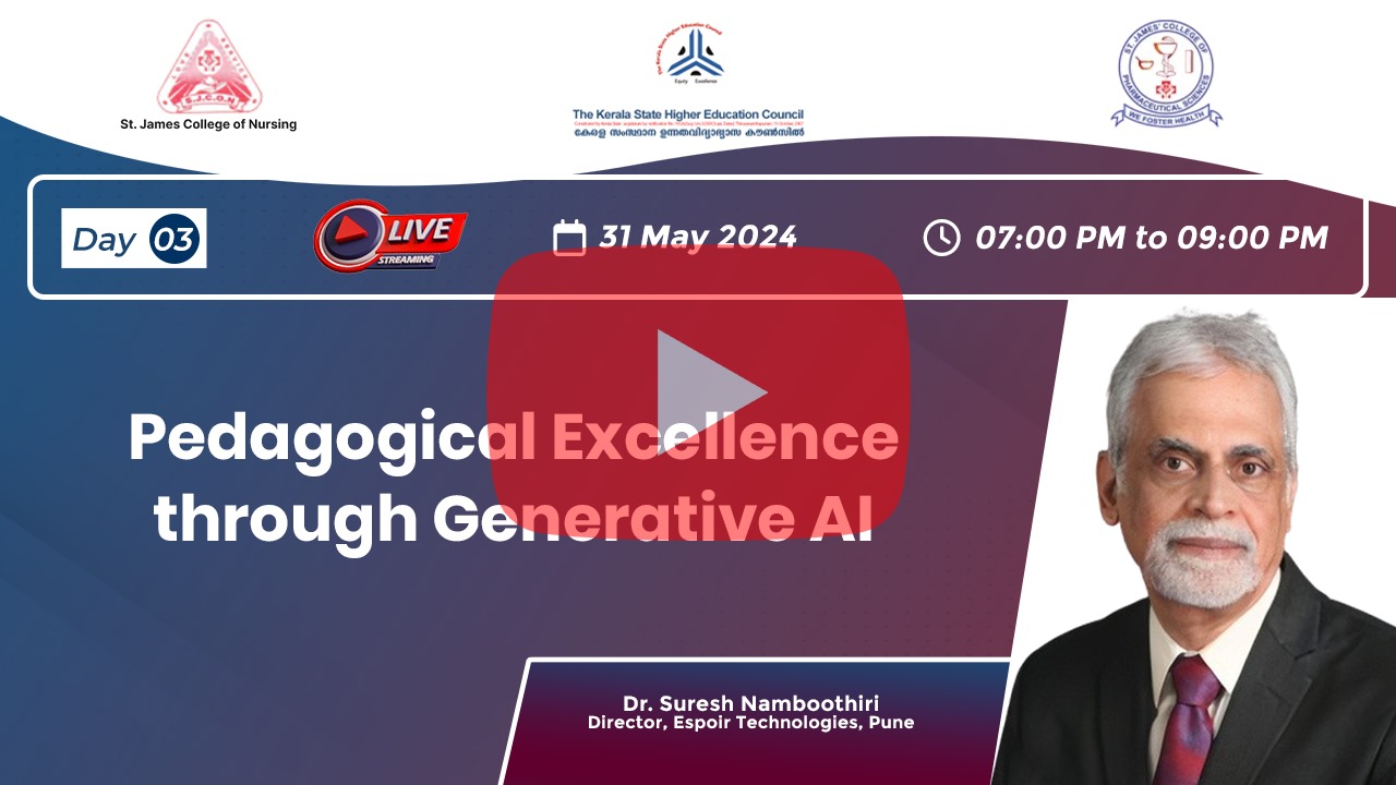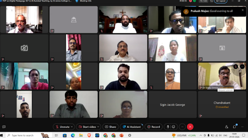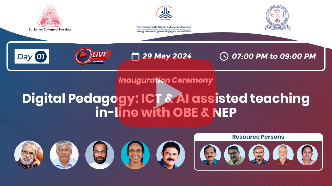 The seven-day National Level Online Faculty Development Programme on Digital Pedagogy: ICT & AI Assisted Teaching in line with OBE & NEP organised by the Internal Quality Assurance Cell of St James College of Nursing and St James College of Pharmaceutical Sciences, Chalakudy in association with the Kerala State Higher Education Council started at 19.00 Hrs on the 29th of May 2024.
