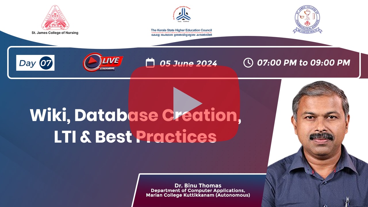 Dr Binu Thomas was the resource person on the final day of the week-long Faculty Development Programme on Digital Pedagogy: ICT and AI-Assisted Teaching in line with NEP and OBE, organised by the Internal Quality Assurance Cells of the St James group of Institutions, Chalakudy in association with The Kerala State Higher Education Council. The day's topics were Wiki, Database Creation, LTI, and Best Practices.