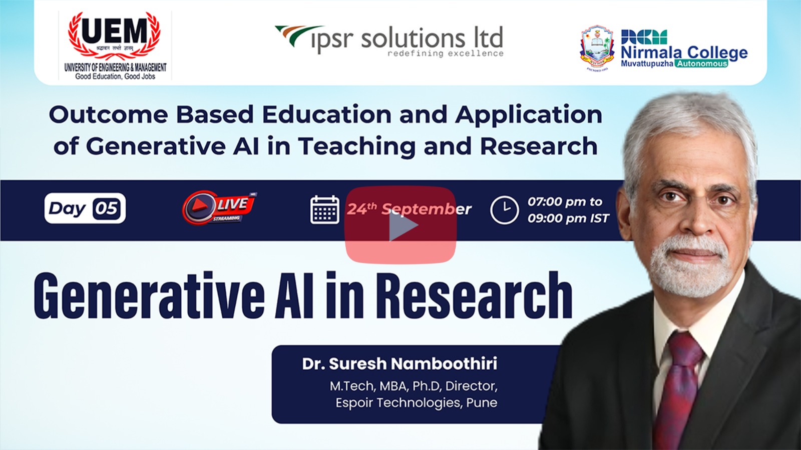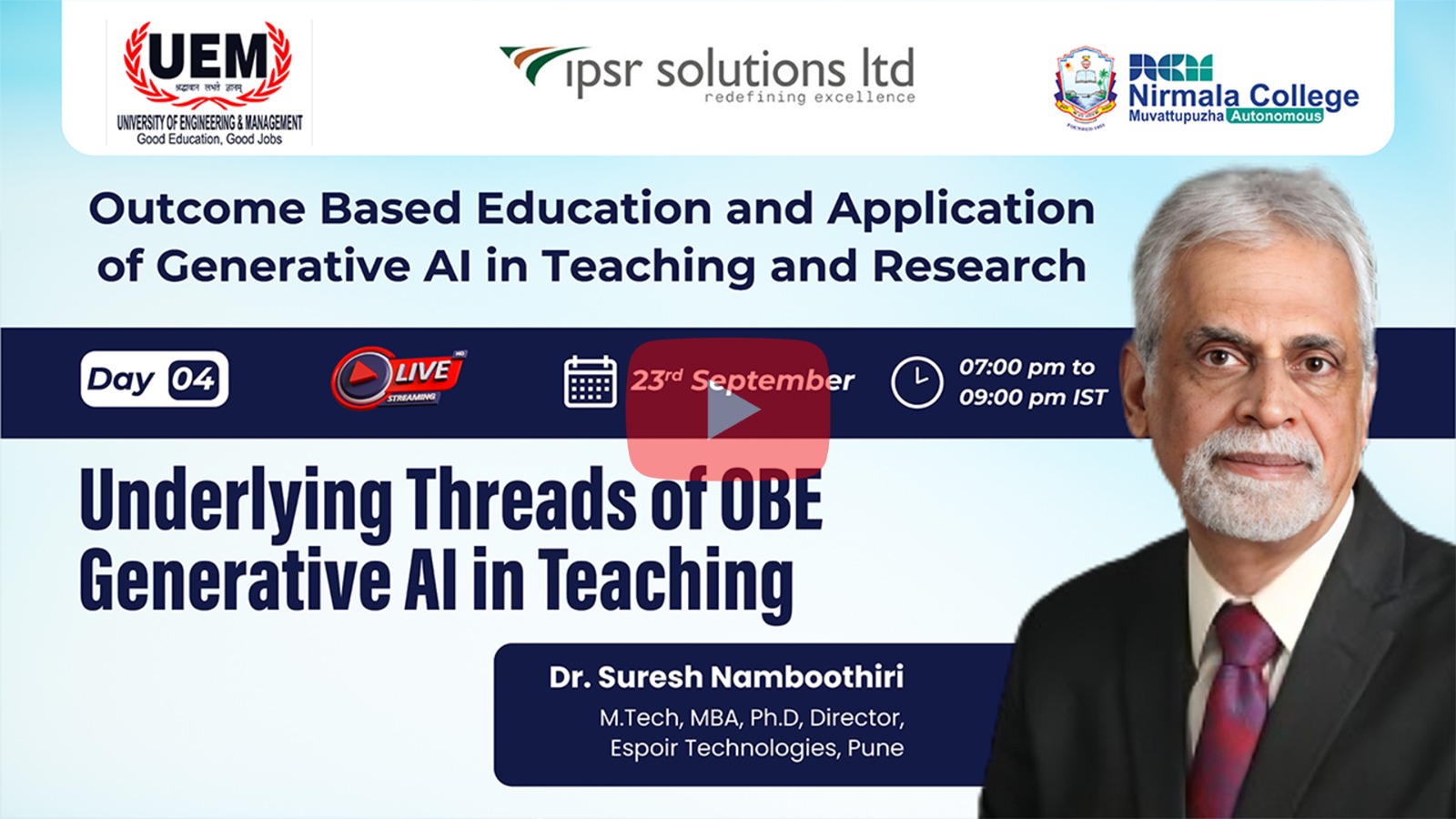 Click to watch the video recording of the fourth day’s session, Underlying Threads of OBE, Generative AI in Teaching by Dr Suresh Namboothiri.