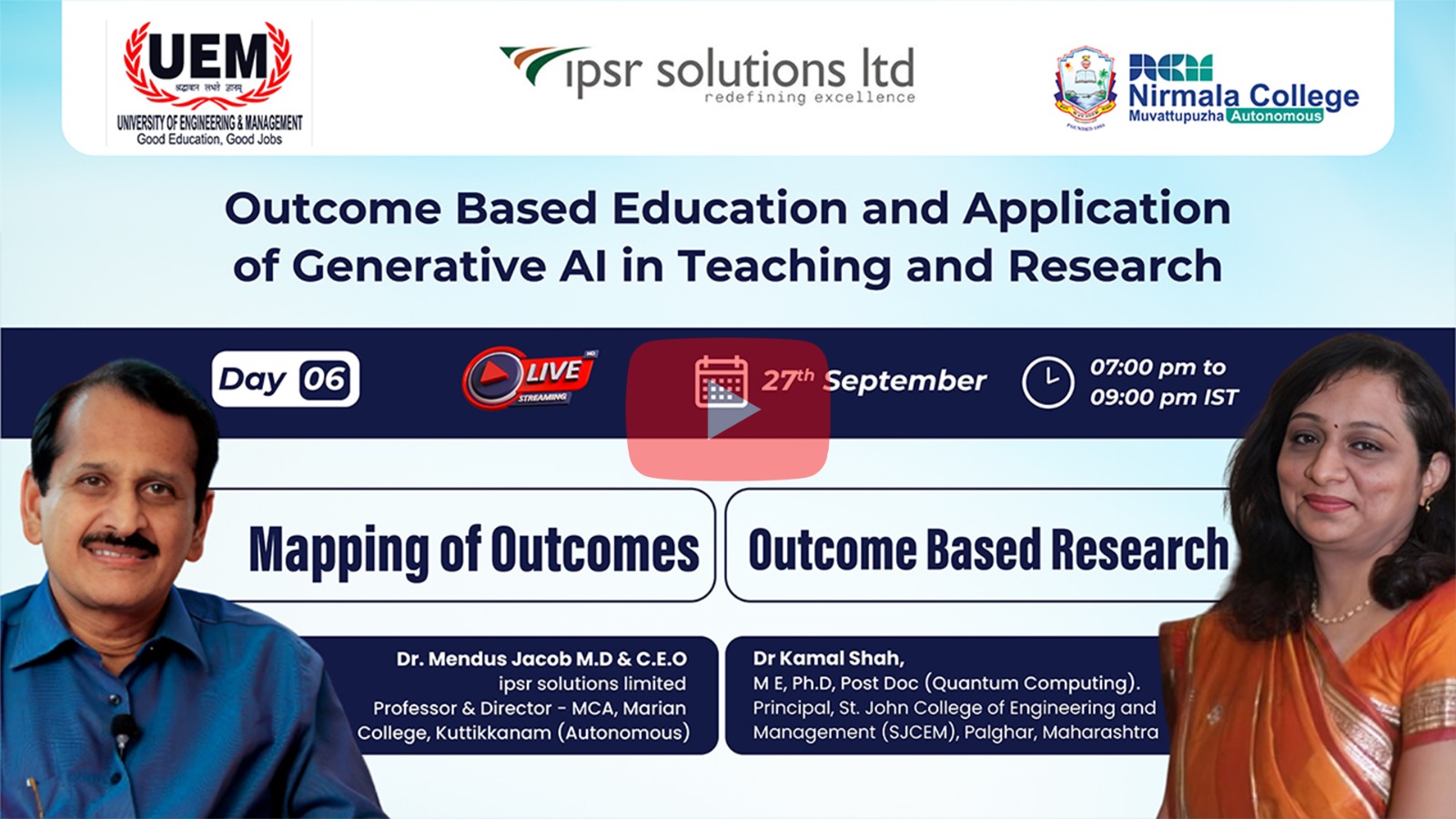 2287 participants took part and benefitted from the seven-day Faculty Development Programme on Outcome Based Education and Application of Generative AI in Teaching and Research organised by the Internal Quality Assurance Cells of the University of Engineering and Management, Jaipur, Rajasthan and Nirmala College, Muvattupuzha, Autonomous in association with ipsr solutions limited.