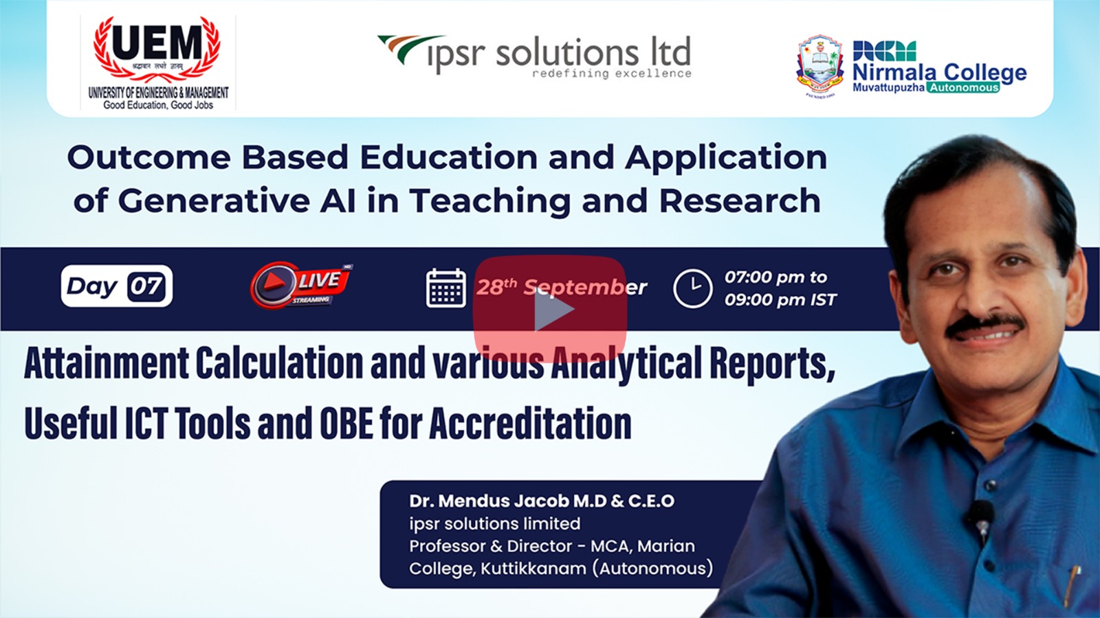 Click to watch the video recording of the seventh day’s session, Attainment Calculation and Various Analytical Reports, Useful ICT Tools and OBE for Accreditation by Dr Mendus Jacob [/fusion_text][/fusion_builder_column][/fusion_builder_row][/fusion_builder_container]