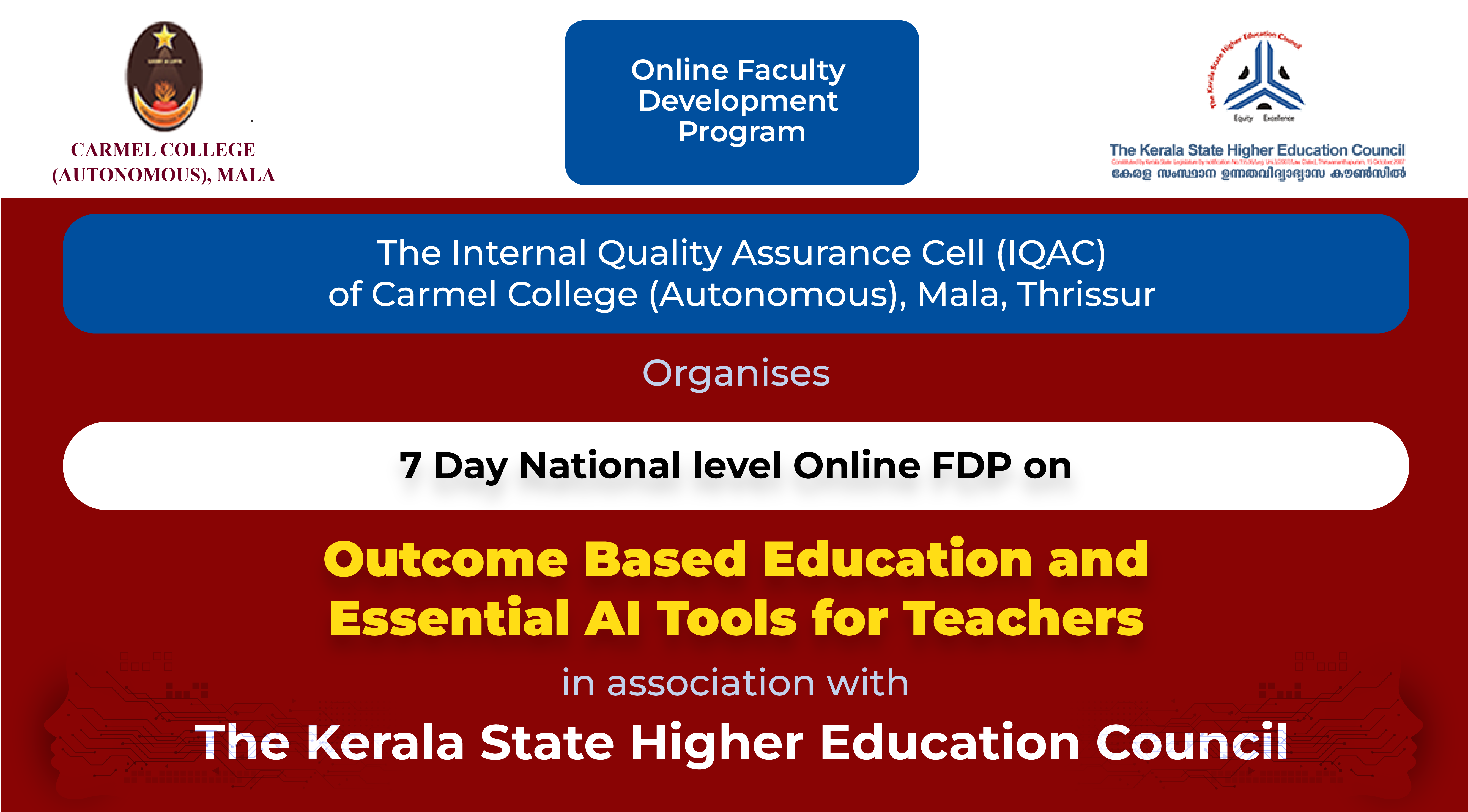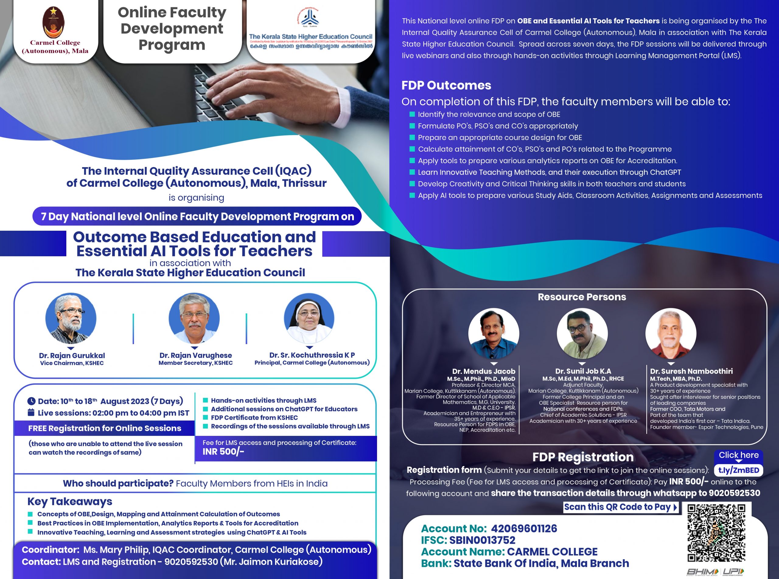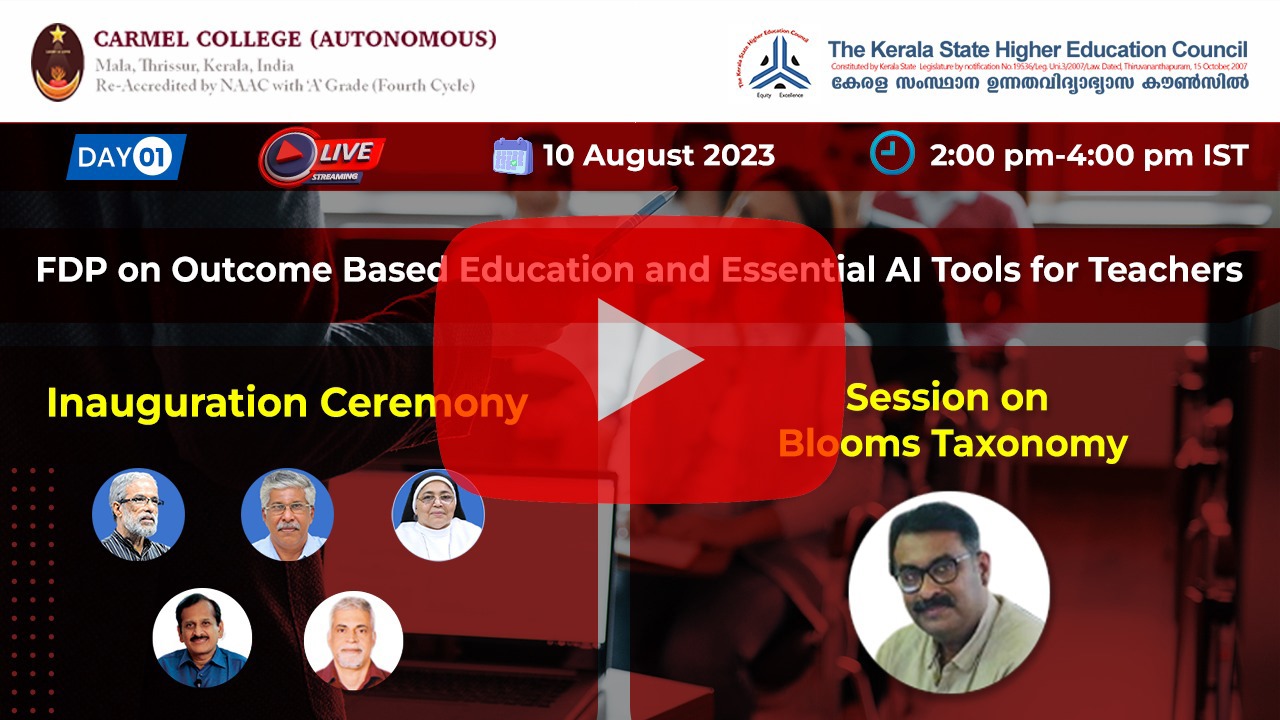 The first-day session of the Faculty Development Programme on Outcome Based Education and Essential AI Tools for Teachers, organised by the Internal Quality Assurance Cell (IQAC) of Carmel College Autonomous, Mala, Thrissur, in association with the Kerala State Higher Education Council (KSHEC), commenced at 2.00 PM on the 10 August 2023.