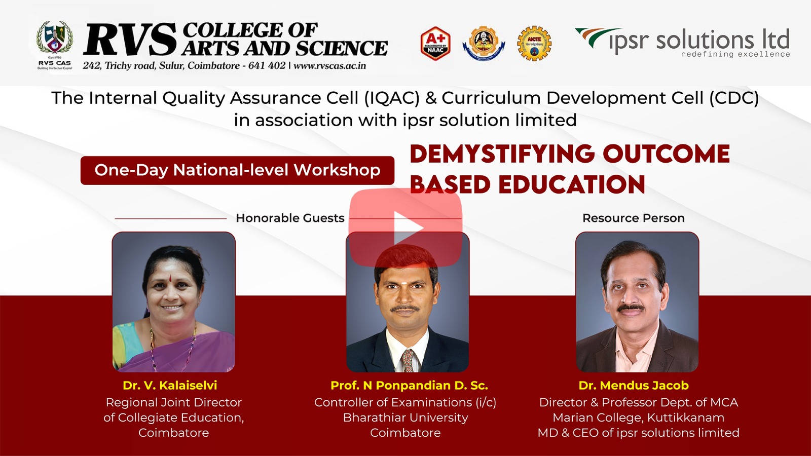 The One-Day National-Level Workshop on Demystifying Outcome-Based Education successfully concluded with positive feedback from participants. The event served as a vital platform for educators to gain insights into OBE and its transformative potential in education. As a valued client of ipsr solutions limited, RVS College of Arts and Science continues to demonstrate its commitment to innovation and excellence in education. With the adoption of QnSmart i and deQ OBE, the institution is setting a benchmark for quality assurance and impactful learning experiences in higher education. This collaboration reaffirms the shared vision of IPSR and RVS College to revolutionize education through cutting-edge solutions, ensuring a brighter future for students and educators alike. Watch the live recordings of the session