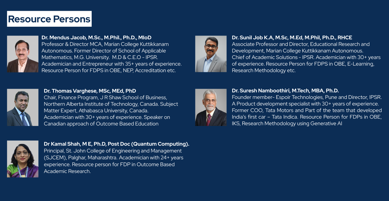 Jointly organised by the IQAC, Jagannath Barooah University, Assam, and the IQAC & the PG Department of Computer Applications, Marian College Kuttikkanam AutonomousThis National level online FDP on OBE and Application of Generative AI in Teaching and Research is being jointly organised by the Internal Quality Assurance Cell, Jagannath Barooah University, Assam, and the Internal Quality Assurance Cell and the PG Department of Computer Applications, Marian College, Kuttikkanam Autonomous in association with ipsr solutions limited. Spread across one week, the FDP sessions will be delivered through live webinars and also through hands-on activities and assessments through Learning Management Portal (LMS).