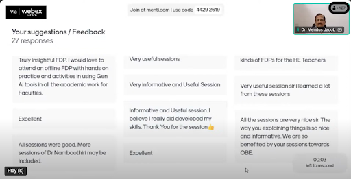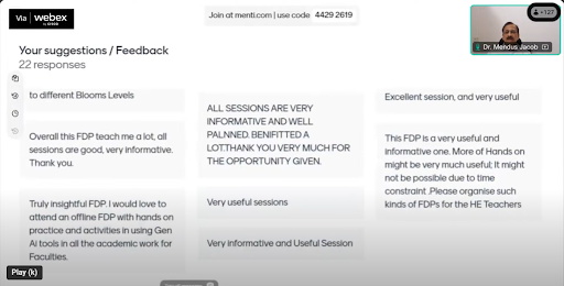The versatile template system allows educators to create customized templates to suit their specific requirements and the gallery of quick templates allows quick question paper generation. The copy, modify and archive facility ensures efficiency and consistency in question paper design. The system can effortlessly generate questions from any topic or discipline and at various levels of Bloom’s Taxonomy. The educators have the flexibility to edit, regenerate, and modify questions ensuring uniqueness in each paper and tailored to their teaching objectives. Being ‘Outcome Based Education’ friendly, the software enables users to input Course Outcomes (COs) and map each question to the respective COs ensuring alignment with curriculum goals and assessment standards. The software, apart from being economical in terms of time and cost, allows users to archive question papers for future reference, reducing the repetitive task of question paper creation. The tool excels in generating accurate answers facilitating the preparation of scoring keys and valuation schemes, and is an invaluable resource for creating a diverse set of options and correct answers for multiple-choice questions, contributing to fair and efficient grading processes. Dr Mendus concluded the session by thanking all the participants for their eager and active participation in the week-long Faculty Development Programme. Two tasks in the form of Multiple Choice Questions were assigned to the participants after the session. Click to watch the sixth-day sessions on AI in research and OBE for Accreditation, and Useful Tools by Dr Suresh Namboothiri and Dr Mendus Jacob. Feedback: