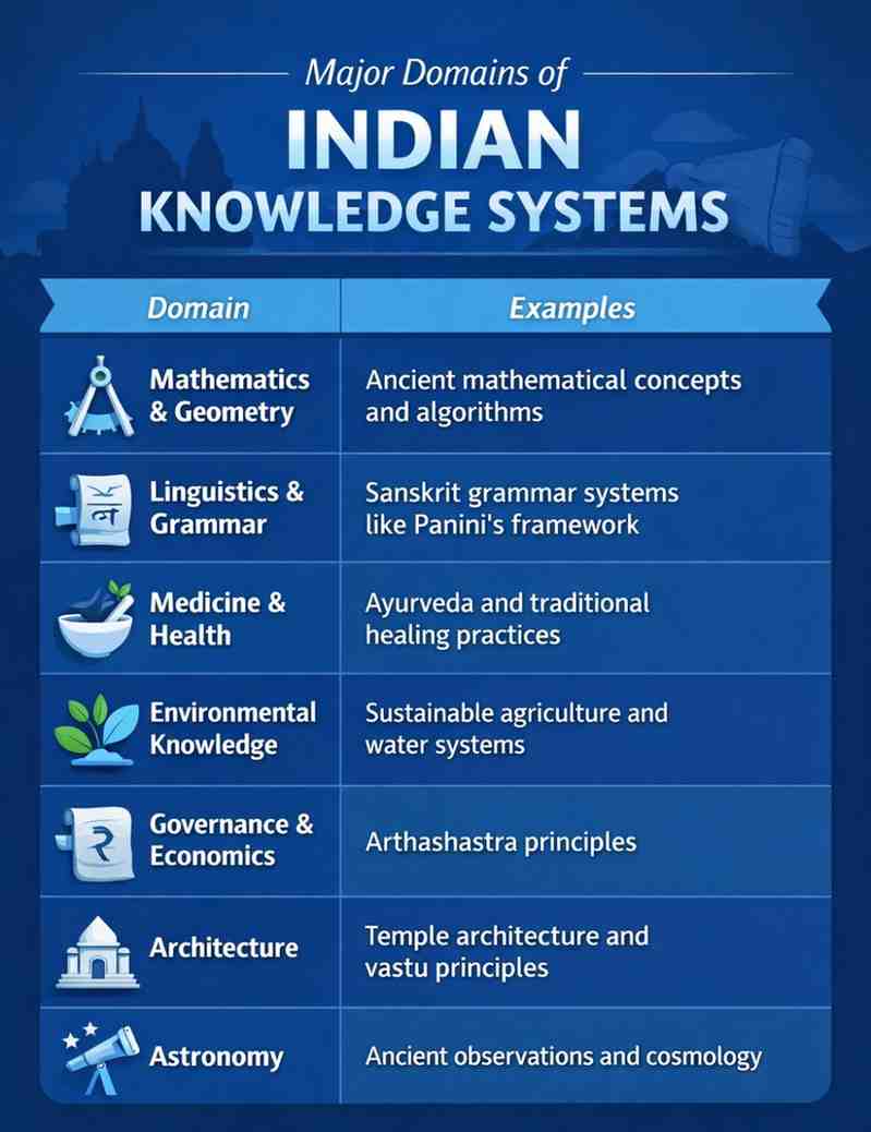 Indian Knowledge Systems refer to traditional knowledge traditions in areas such as mathematics, medicine, governance, linguistics, ecology, and philosophy that are being integrated into modern academic curricula.