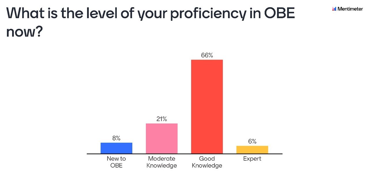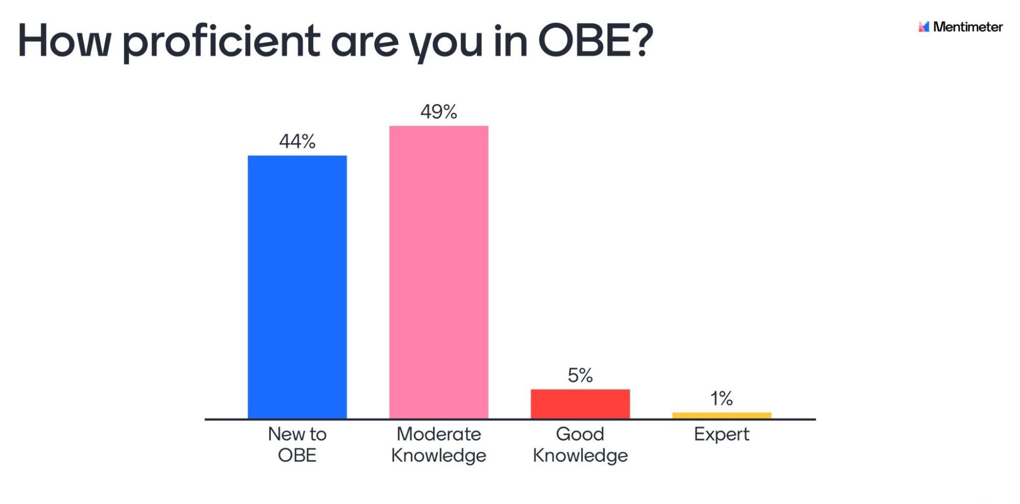 Before the session started on the topic of OBE, people were not having much clarity about OBE. The below bar chart image represents a Mentimeter poll based on the topic “How proficient are you in OBE?”.The bar chart illustrates that the highest percentage of respondents was having only moderate knowledge about the topic and it was 49%, 44% of the respondents were new to OBE, 5% of the respondents were having good knowledge and 1% of this group was expert in OBE.