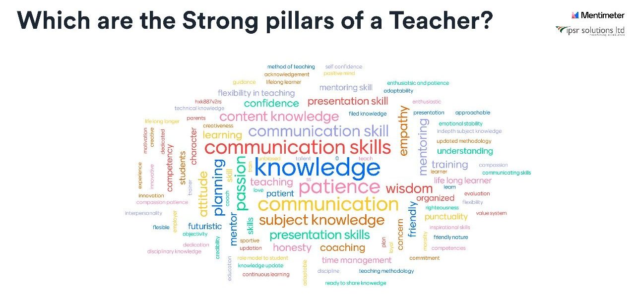 This event has witnessed some interesting question-answer sessions and also witnessed usage of Mentimeter Polls which simultaneously resulted in a good outcome. One interesting question raised by Dr. Mendus Jacob was; "Which are the strong pillars of Teacher? '' subsequently answered by the experts in the form of word Art.
