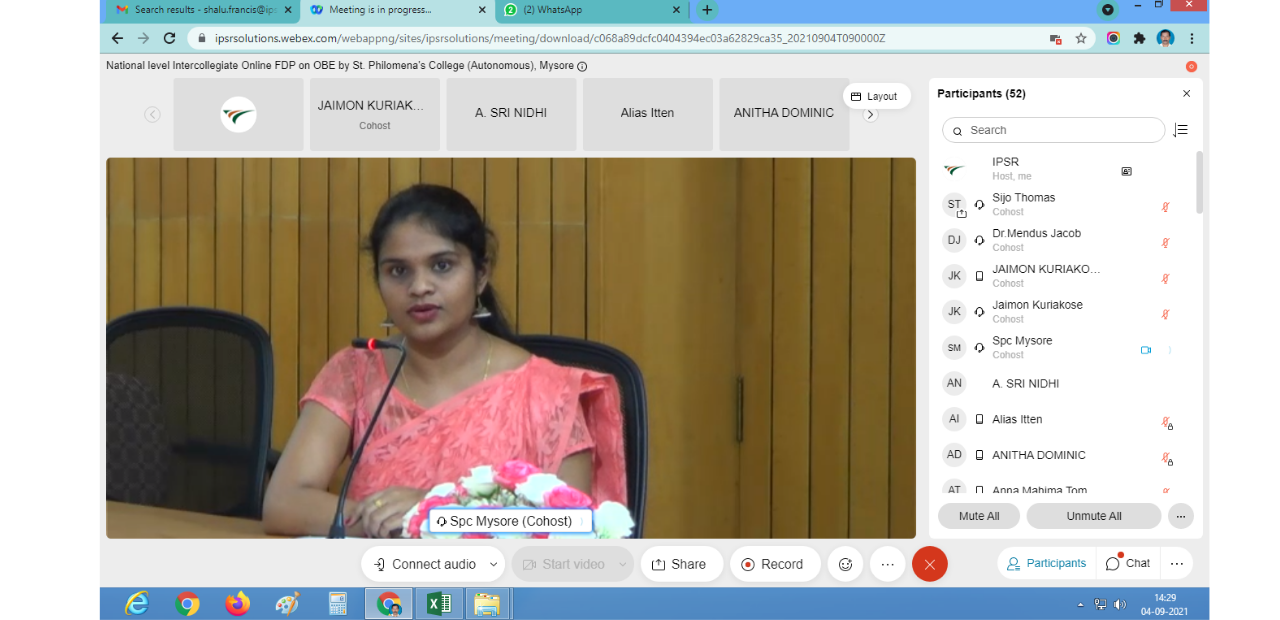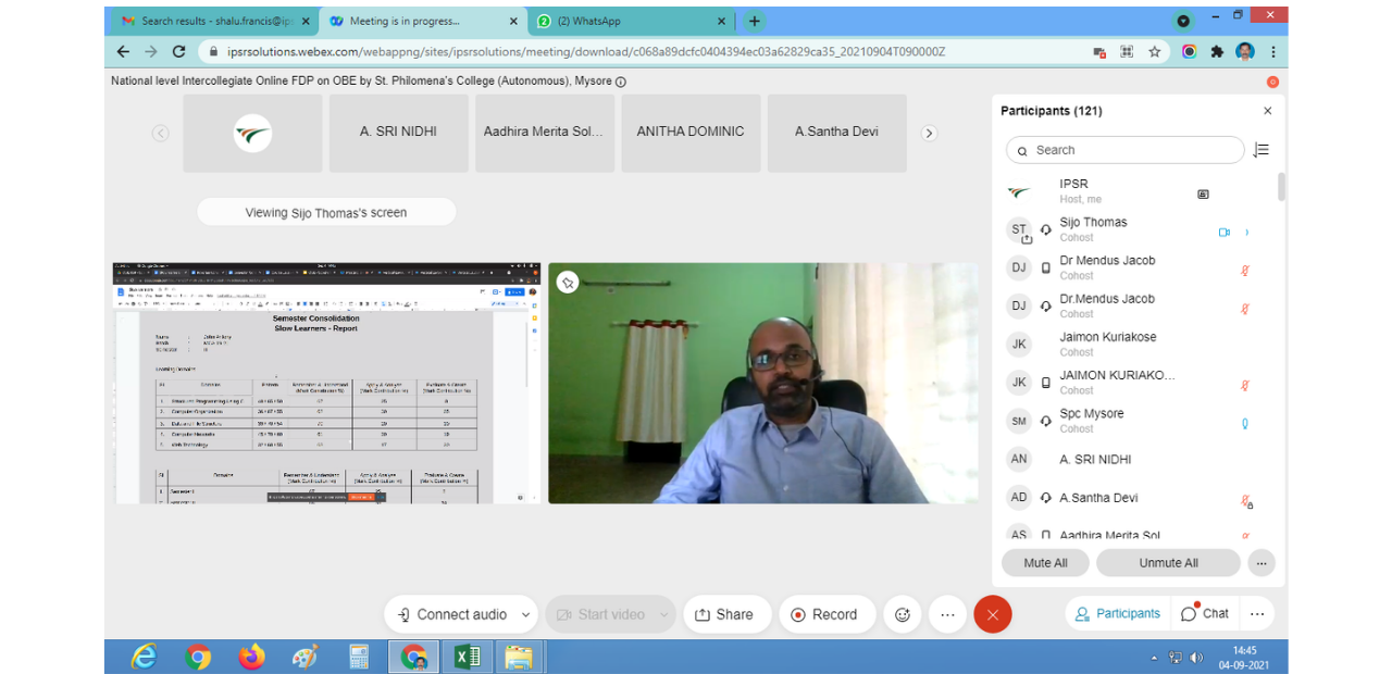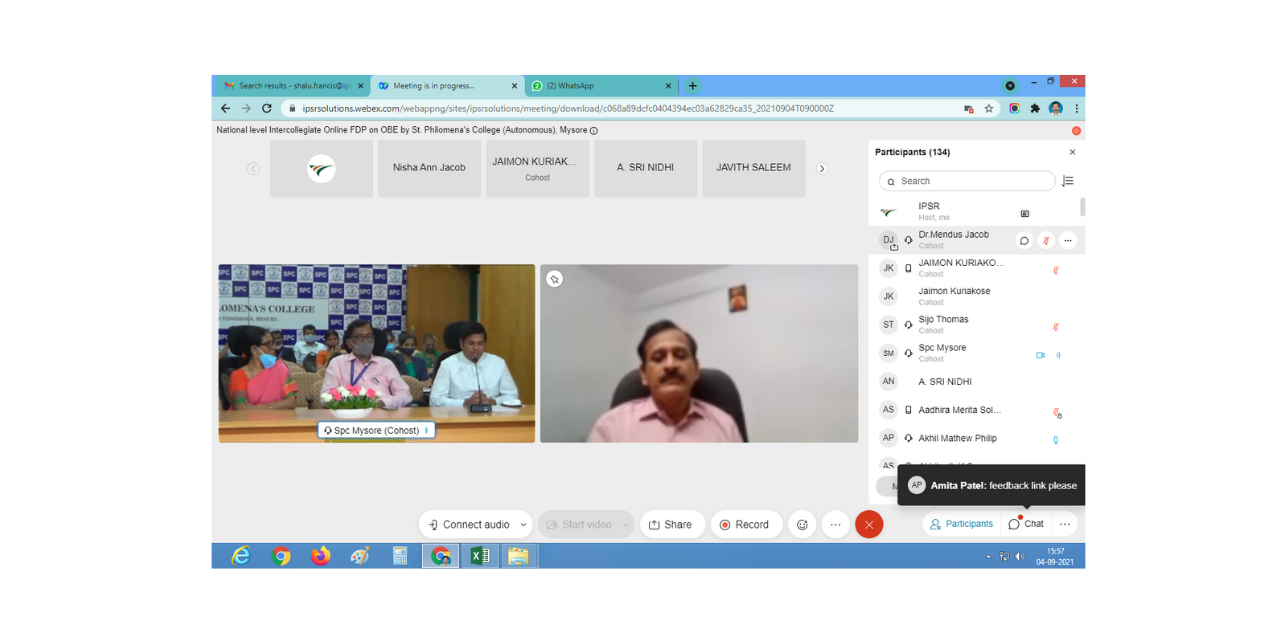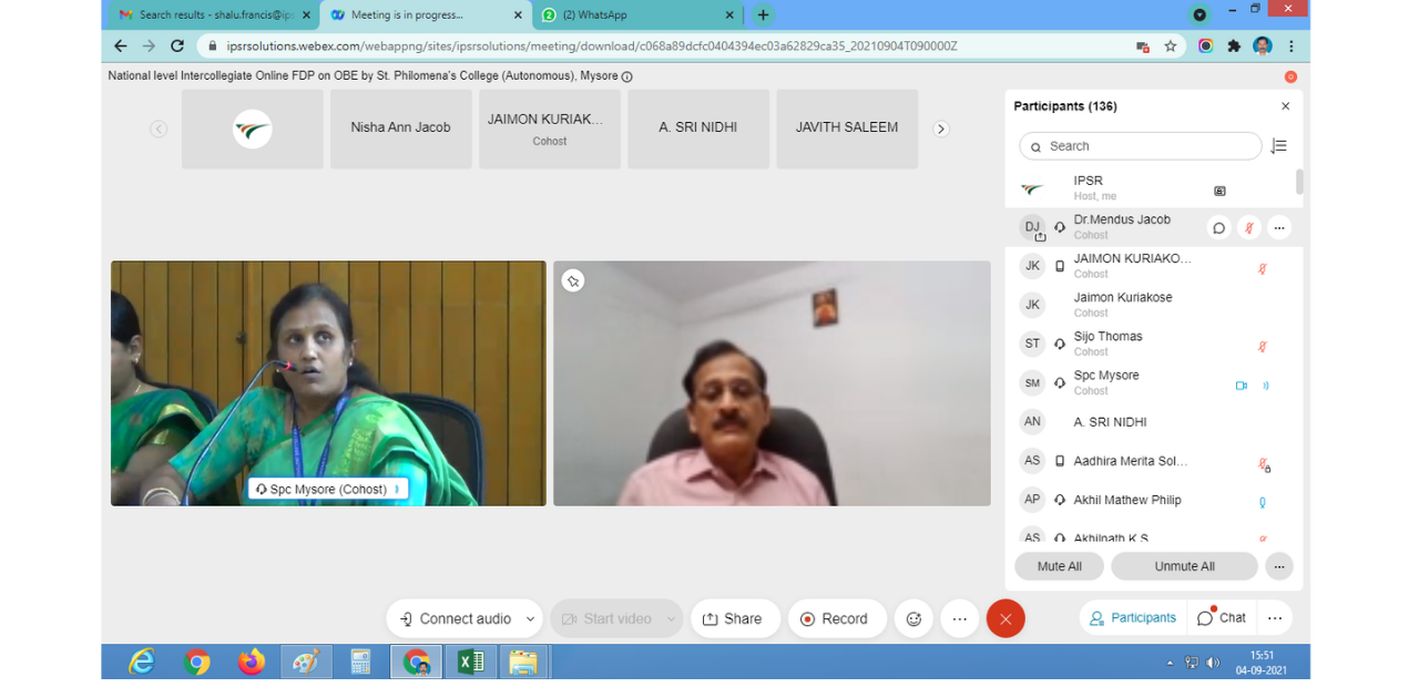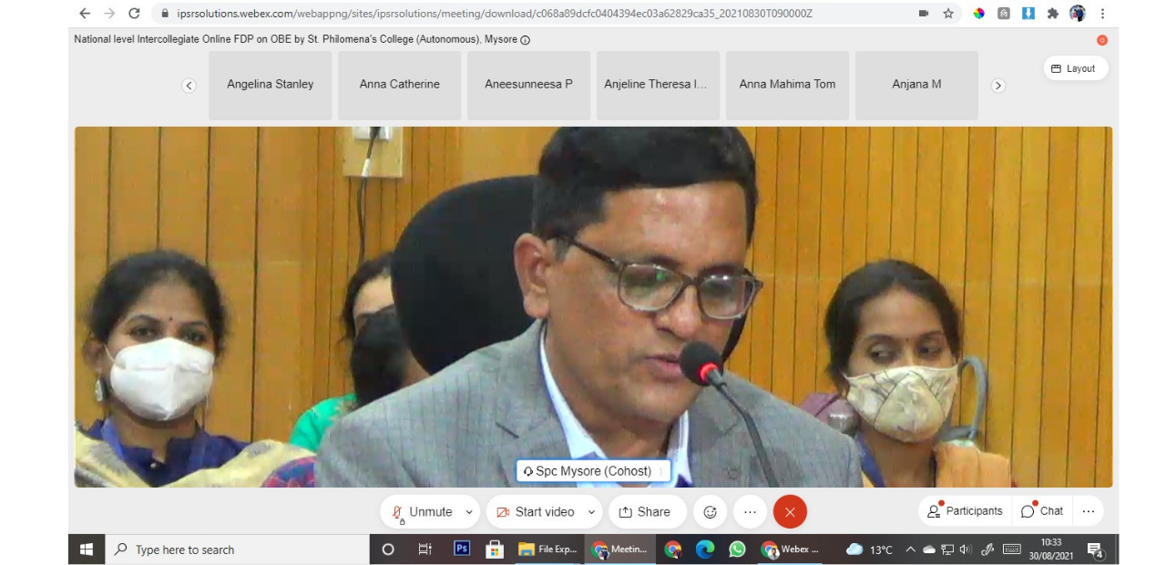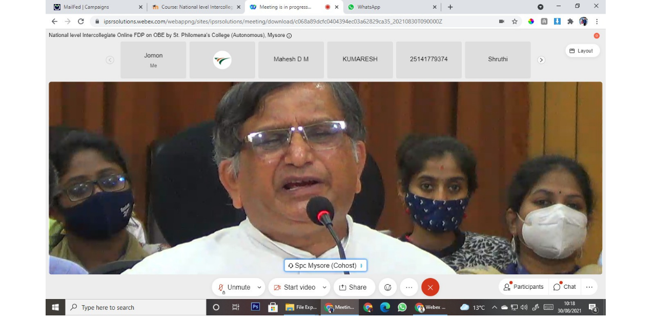 The first day of the National-level Intercollegiate Online Faculty Development Program began with the Inaugural Session on (30th August 2021) at 2:30 pm, and it was organized by the Academic Session of St. Philomena's College Mysore, in the presence of Rev. Monsg. Leslie Moras (Episcopal Vicar - Diocese of Mysore ), and Dr. Mendus Jacob (Guest of Honour - CEO IPSR), Rev.Dr. Bernard Prakash Barnis (Rector/Manager), Rev.Fr.Maria Xavier (Vice-Rector), Rev. Fr. John Paul R (Campus Administrator), Dr. Alphonsus D’Souza (Principal), Mr. Vidhyadhar Sanjay Nair (Vice Principal), Prof.Othbert Pinto (PG Director), and Mr. Britto Dominic Rayan (Controller of Examinations). The program was followed by, Introductory Remarks by Dr. Mendus Jacob - M.Sc., M.Phil., Ph.D., MIoD, M.D & C.E.O - IPSR & Valin Technologies, U.K. Director - MCA, Marian College, Kuttikkanam (Autonomous), Former Director of School of Applicable Mathematics, M.G. University and Academician and Entrepreneur with 30+ years of experience.