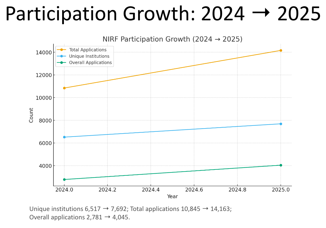 - Participation hit records: 7,692 unique institutions filed 14,163 applications; 4,045 in Overall alone. (2024 baselines were lower.)