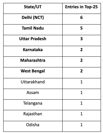 Delhi and Tamil Nadu dominate the first quartile. UP is the next major bloc in the Top-25, while Karnataka and Maharashtra hold steady with two each.