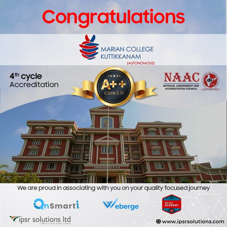 Marian College Kuttikanam (Autonomous), has been accredited with A++ (3.71 Cgpa) by NAAC.
