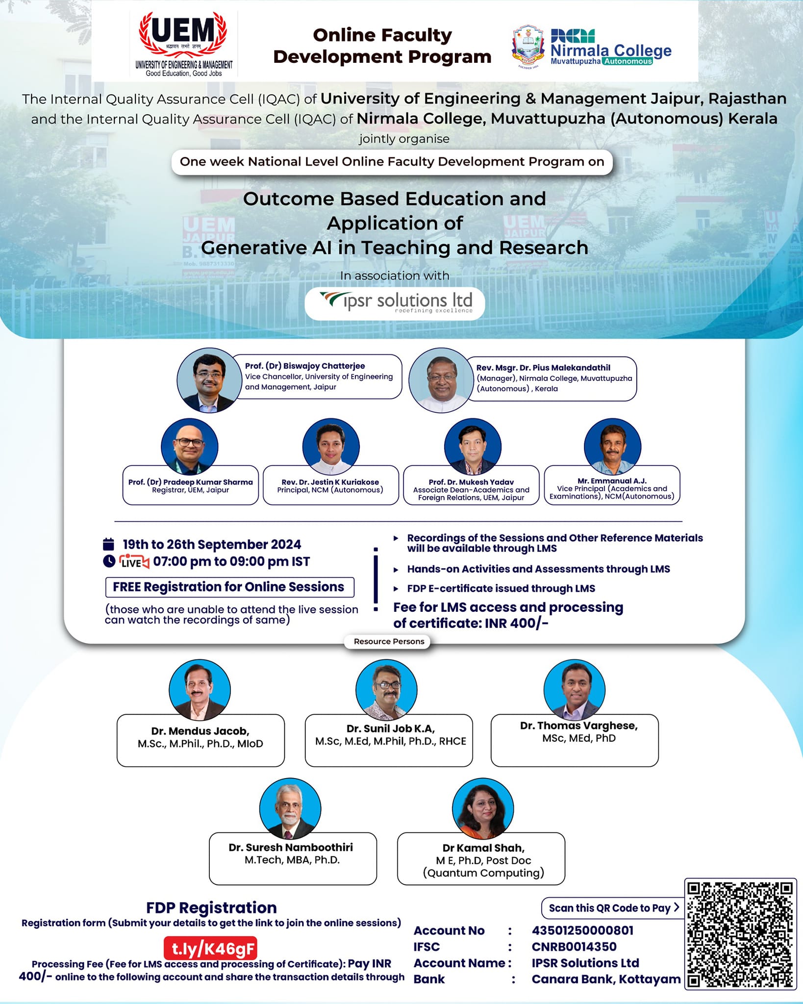 𝐔𝐧𝐢𝐯𝐞𝐫𝐬𝐢𝐭𝐲 𝐨𝐟 𝐄𝐧𝐠𝐢𝐧𝐞𝐞𝐫𝐢𝐧𝐠 & 𝐌𝐚𝐧𝐚𝐠𝐞𝐦𝐞𝐧𝐭 𝐉𝐚𝐢𝐩𝐮𝐫, 𝐑𝐚𝐣𝐚𝐬𝐭𝐡𝐚𝐧 and 𝐍𝐢𝐫𝐦𝐚𝐥𝐚 𝐂𝐨𝐥𝐥𝐞𝐠𝐞, 𝐌𝐮𝐯𝐚𝐭𝐭𝐮𝐩𝐮𝐳𝐡𝐚 (𝐀𝐮𝐭𝐨𝐧𝐨𝐦𝐨𝐮𝐬) 𝐊𝐞𝐫𝐚𝐥𝐚 jointly organises a National level Online Faculty Development Program on 𝐎𝐮𝐭𝐜𝐨𝐦𝐞 𝐁𝐚𝐬𝐞𝐝 𝐄𝐝𝐮𝐜𝐚𝐭𝐢𝐨𝐧 𝐚𝐧𝐝 𝐀𝐩𝐩𝐥𝐢𝐜𝐚𝐭𝐢𝐨𝐧 𝐨𝐟 𝐆𝐞𝐧𝐞𝐫𝐚𝐭𝐢𝐯𝐞 𝐀𝐈 𝐢𝐧 𝐓𝐞𝐚𝐜𝐡𝐢𝐧𝐠 𝐚𝐧𝐝 𝐑𝐞𝐬𝐞𝐚𝐫𝐜𝐡 in association with 𝐢𝐩𝐬𝐫 𝐬𝐨𝐥𝐮𝐭𝐢𝐨𝐧𝐬 𝐥𝐢𝐦𝐢𝐭𝐞𝐝.
