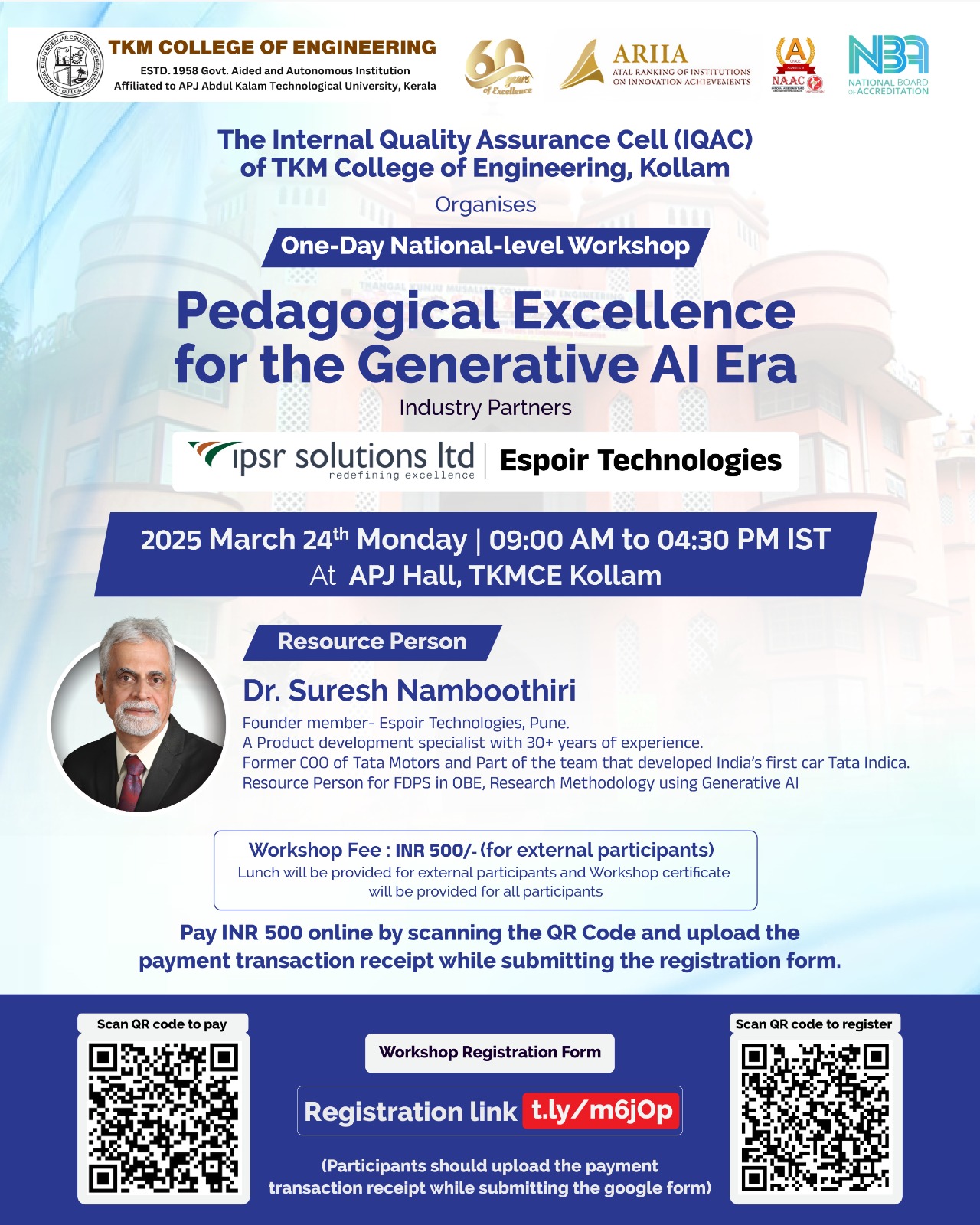 TKM College of Engineering, Kollam is organizing a One-day National-level offline Workshop on Pedagogical Excellence for the Generative AI Era in collaboration with Espoir Technologies and ipsr solutions limited