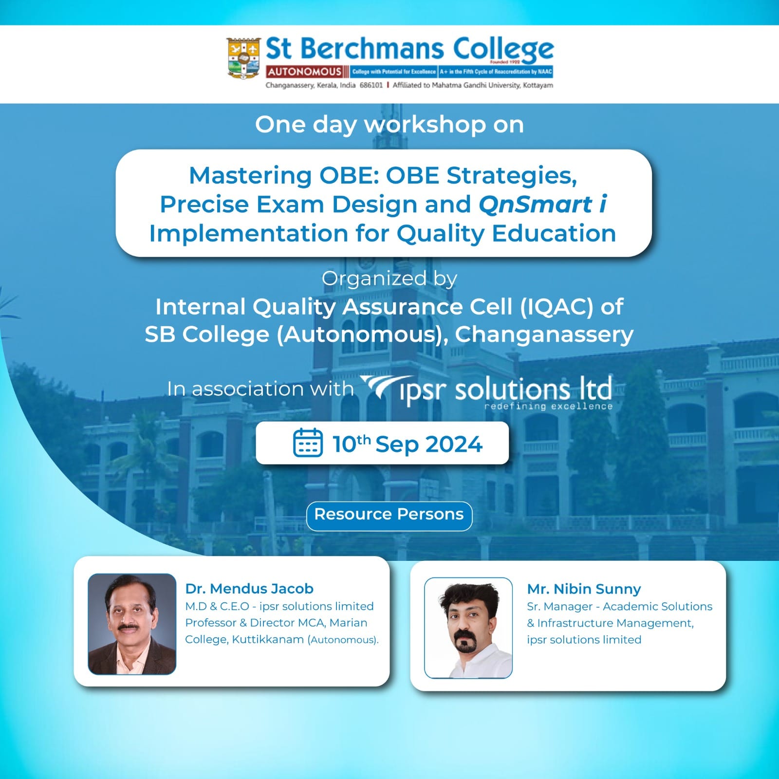 St. Berchmans College (Autonomous) organizes a one-day workshop on "Mastering OBE: OBE Strategies, Precise Exam Design, and QnSmart i Implementation for Quality Education" in association with