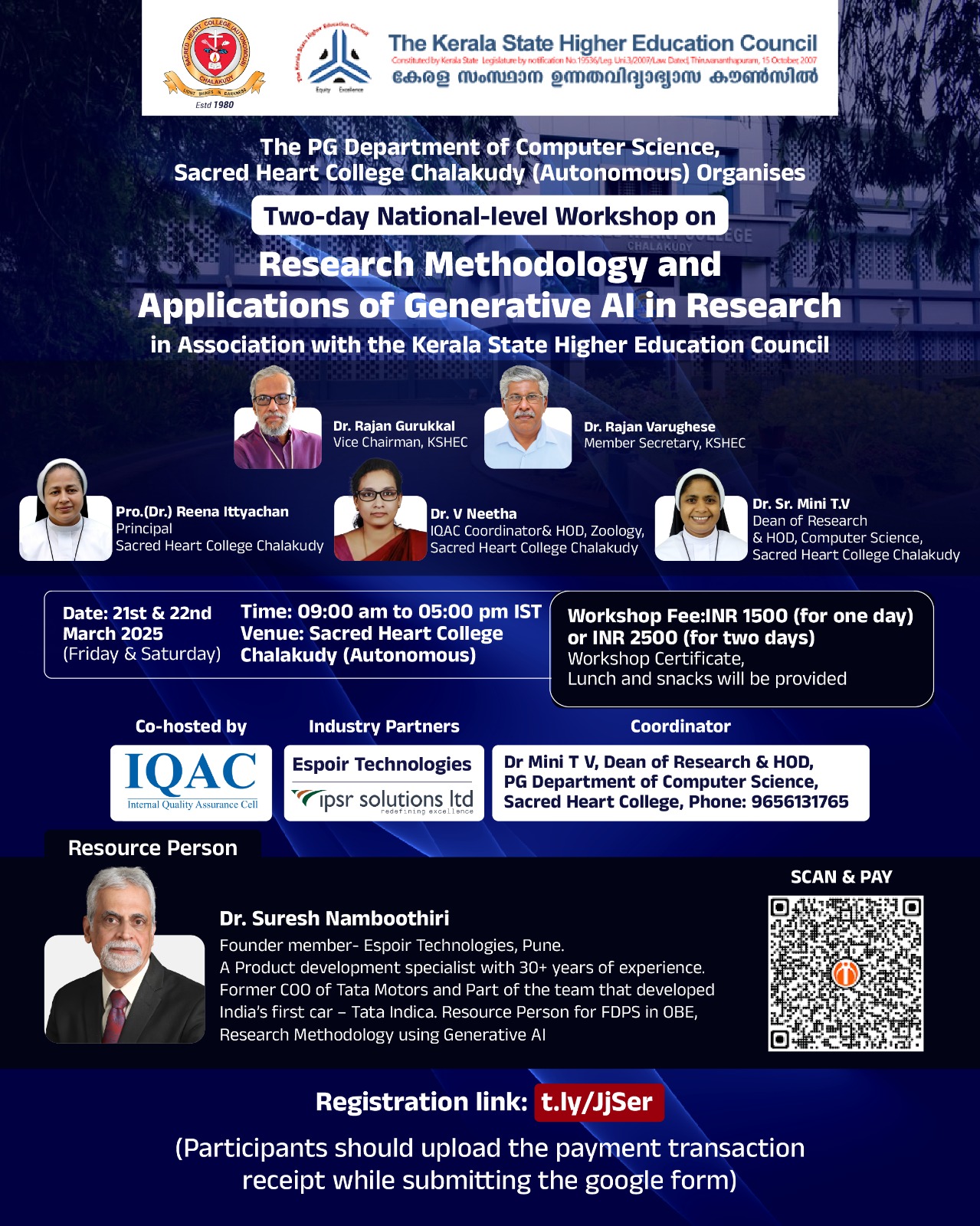 𝐒𝐚𝐜𝐫𝐞𝐝 𝐇𝐞𝐚𝐫𝐭 𝐂𝐨𝐥𝐥𝐞𝐠𝐞 𝐂𝐡𝐚𝐥𝐚𝐤𝐮𝐝𝐲 (𝐀𝐮𝐭𝐨𝐧𝐨𝐦𝐨𝐮𝐬) is organizing a 𝐓𝐰𝐨-𝐃𝐚𝐲 𝐍𝐚𝐭𝐢𝐨𝐧𝐚𝐥-𝐥𝐞𝐯𝐞𝐥 𝐨𝐟𝐟𝐥𝐢𝐧𝐞 𝐖𝐨𝐫𝐤𝐬𝐡𝐨𝐩 on 𝐑𝐞𝐬𝐞𝐚𝐫𝐜𝐡 𝐌𝐞𝐭𝐡𝐨𝐝𝐨𝐥𝐨𝐠𝐲 𝐚𝐧𝐝 𝐀𝐩𝐩𝐥𝐢𝐜𝐚𝐭𝐢𝐨𝐧𝐬 𝐨𝐟 𝐆𝐞𝐧𝐞𝐫𝐚𝐭𝐢𝐯𝐞 𝐀𝐈 𝐢𝐧 𝐑𝐞𝐬𝐞𝐚𝐫𝐜𝐡 in association with KSHEC