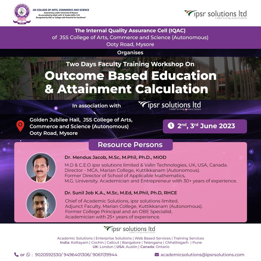 A two-day Faculty Training Workshop on Outcome Based Education and Attainment Calculation organized by JSS College of Arts, Commerce, and Science, Mysore, in association with ipsr solutions limited.