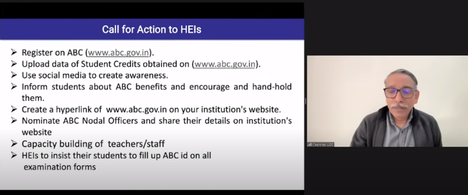 Vice chancellors of universities were urged to ensure complete registration on the ABC portal for the upcoming 2023–24 academic year by University Grants Commission (UGC) chairman M. Jagadesh Kumar during a meeting on Tuesday, February 14, 2023, which evaluated the implementation of the National Education Policy (NEP) 2020. VCs reported that many students are facing a problem owing to Aadhaar-related issues.