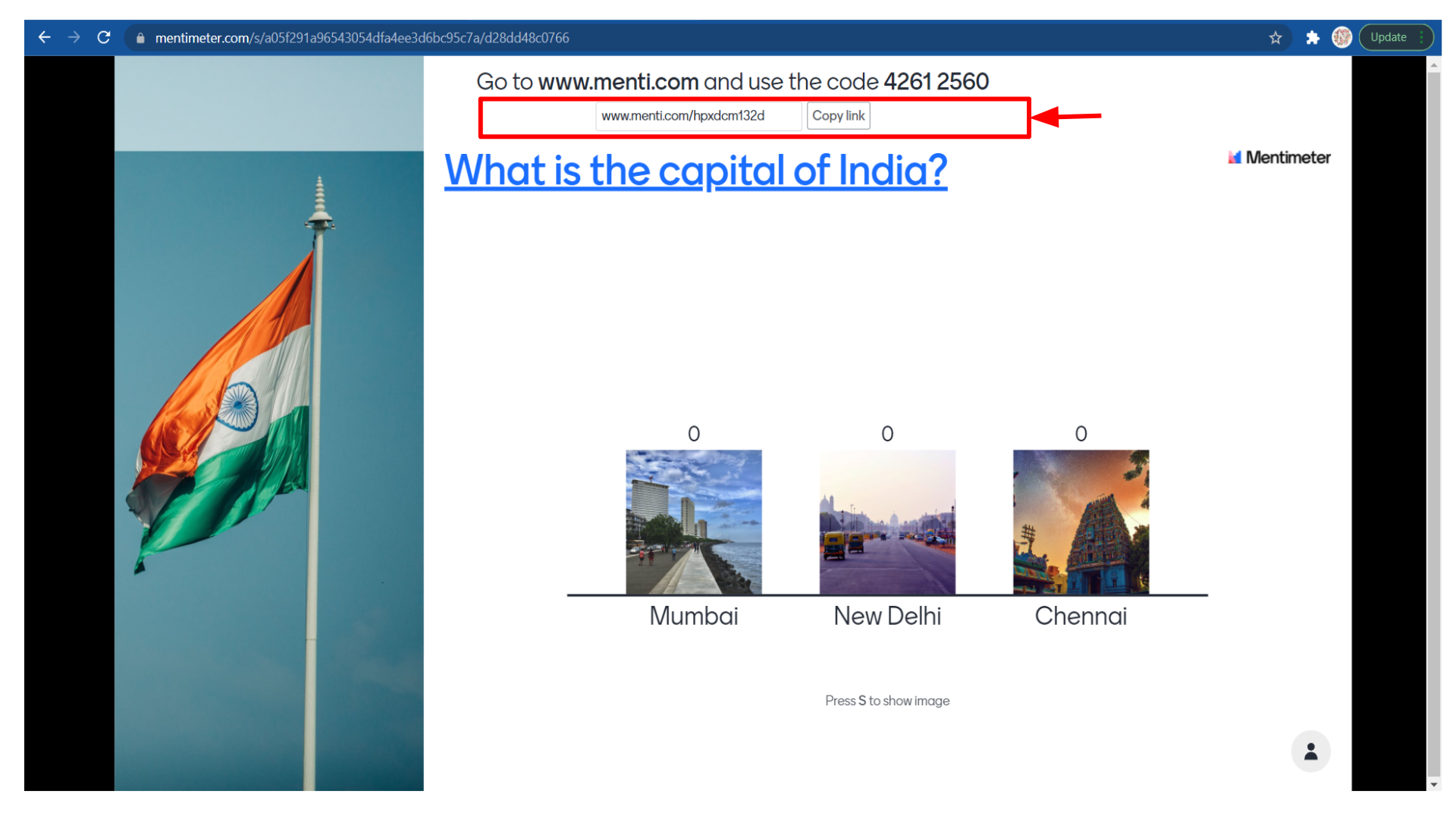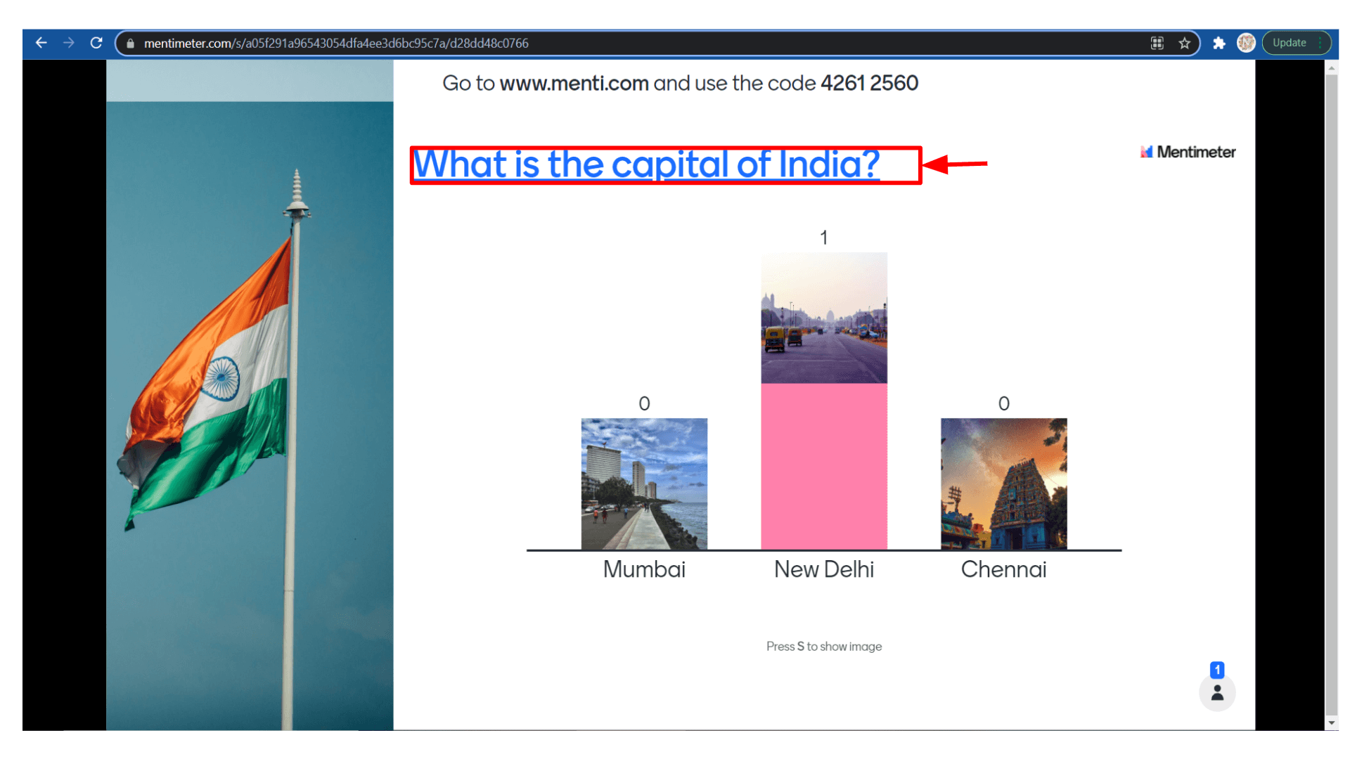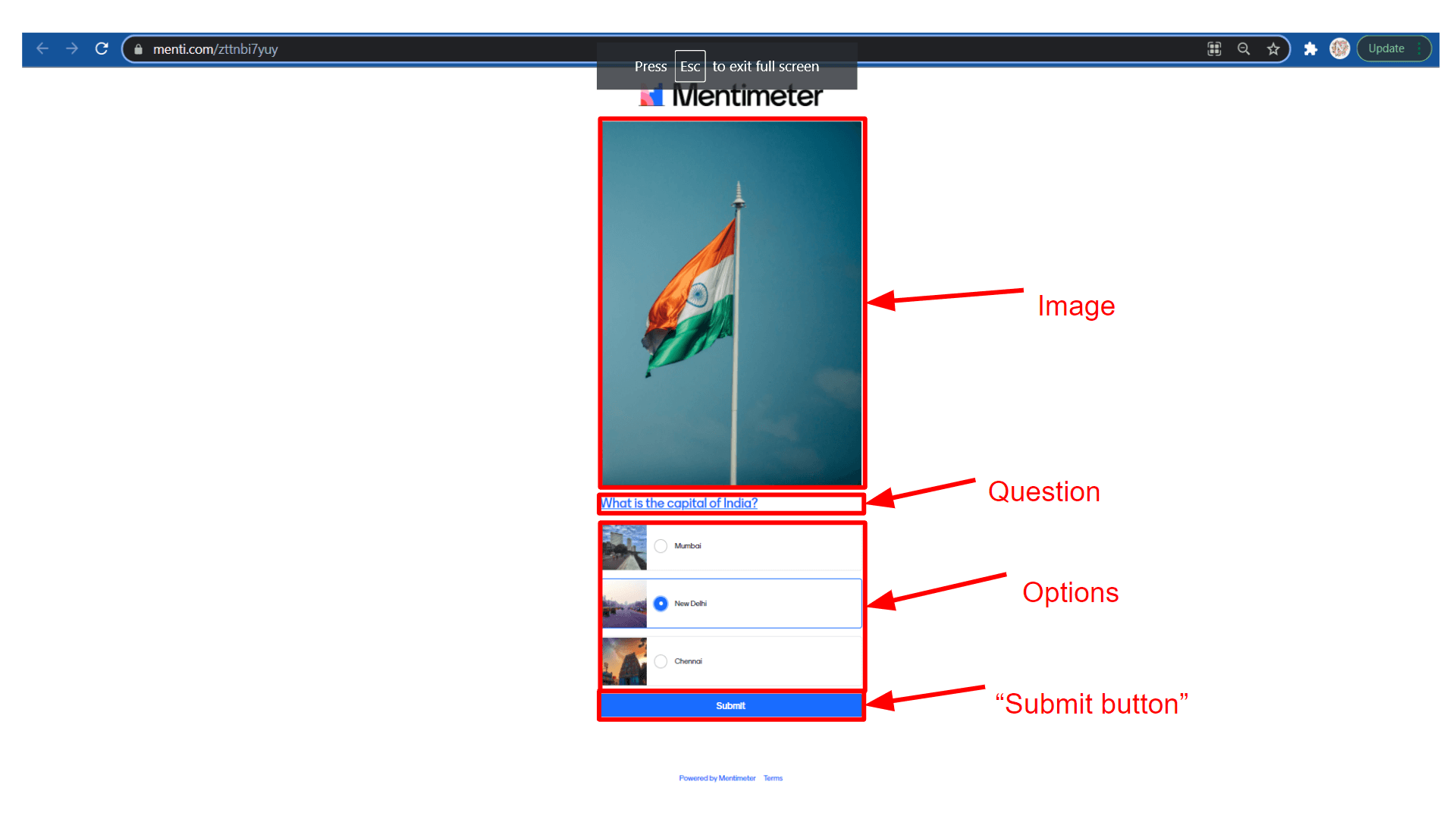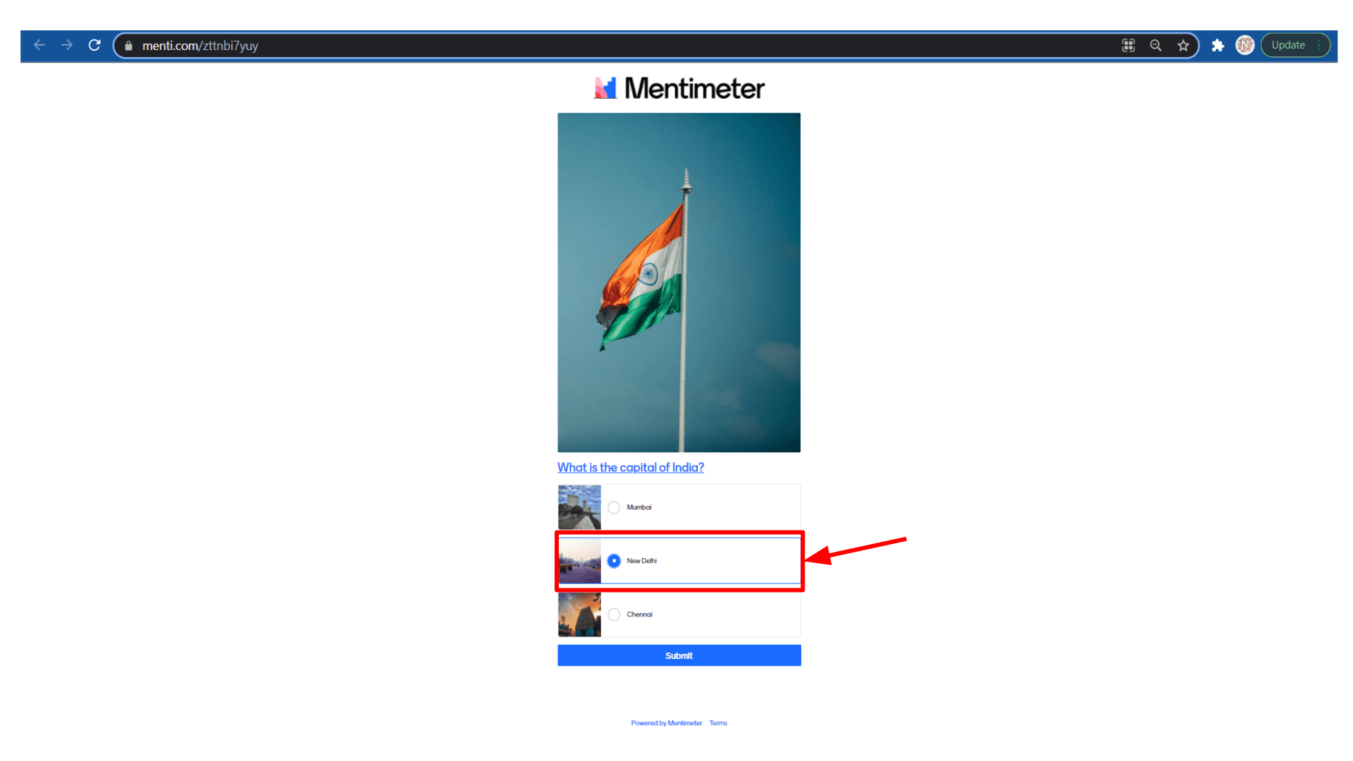 Now open the Mentimeter link in a new tab if you want to see how students will see this particular question. So they will see the image first then the question and then the options. They can select an option and click on the submit button to submit their answers.