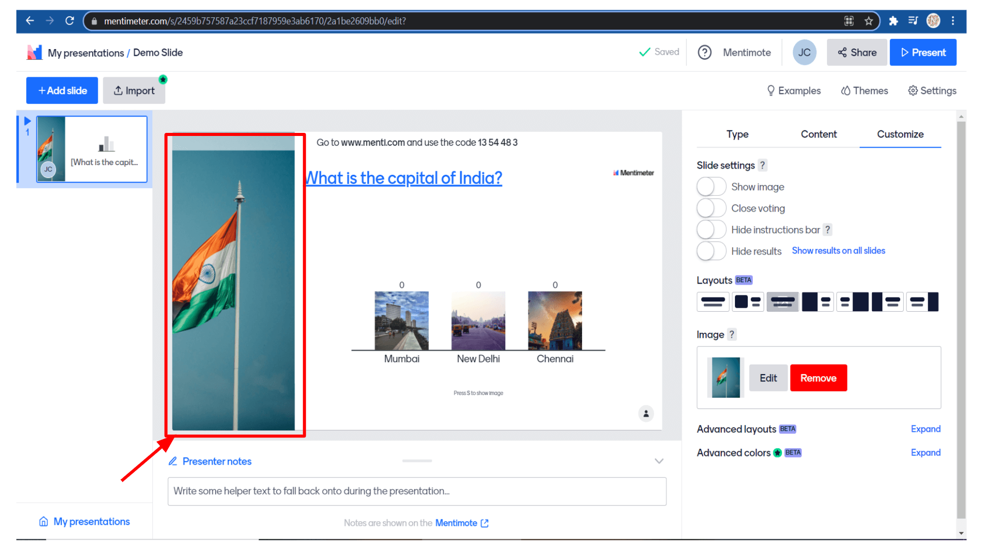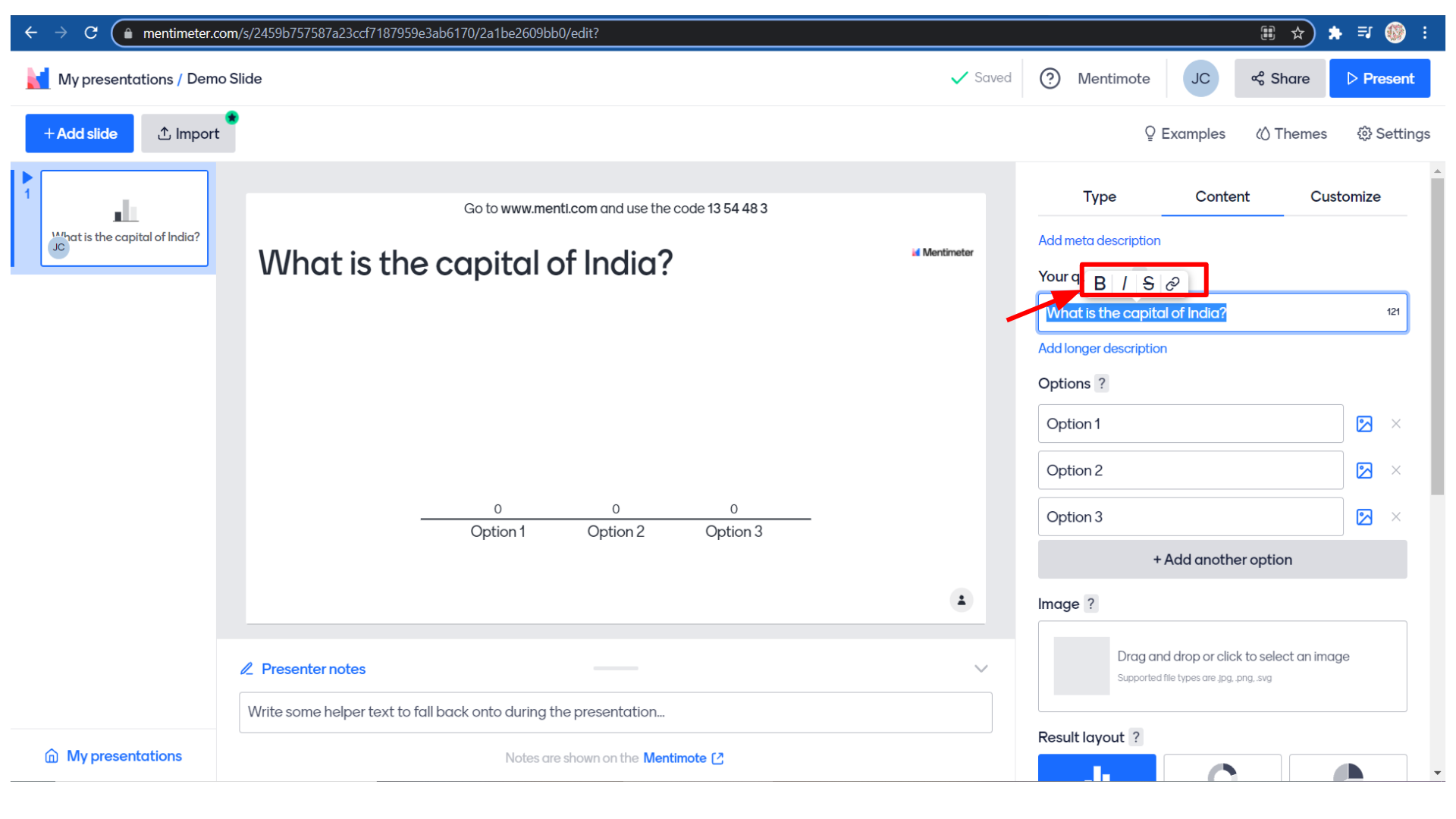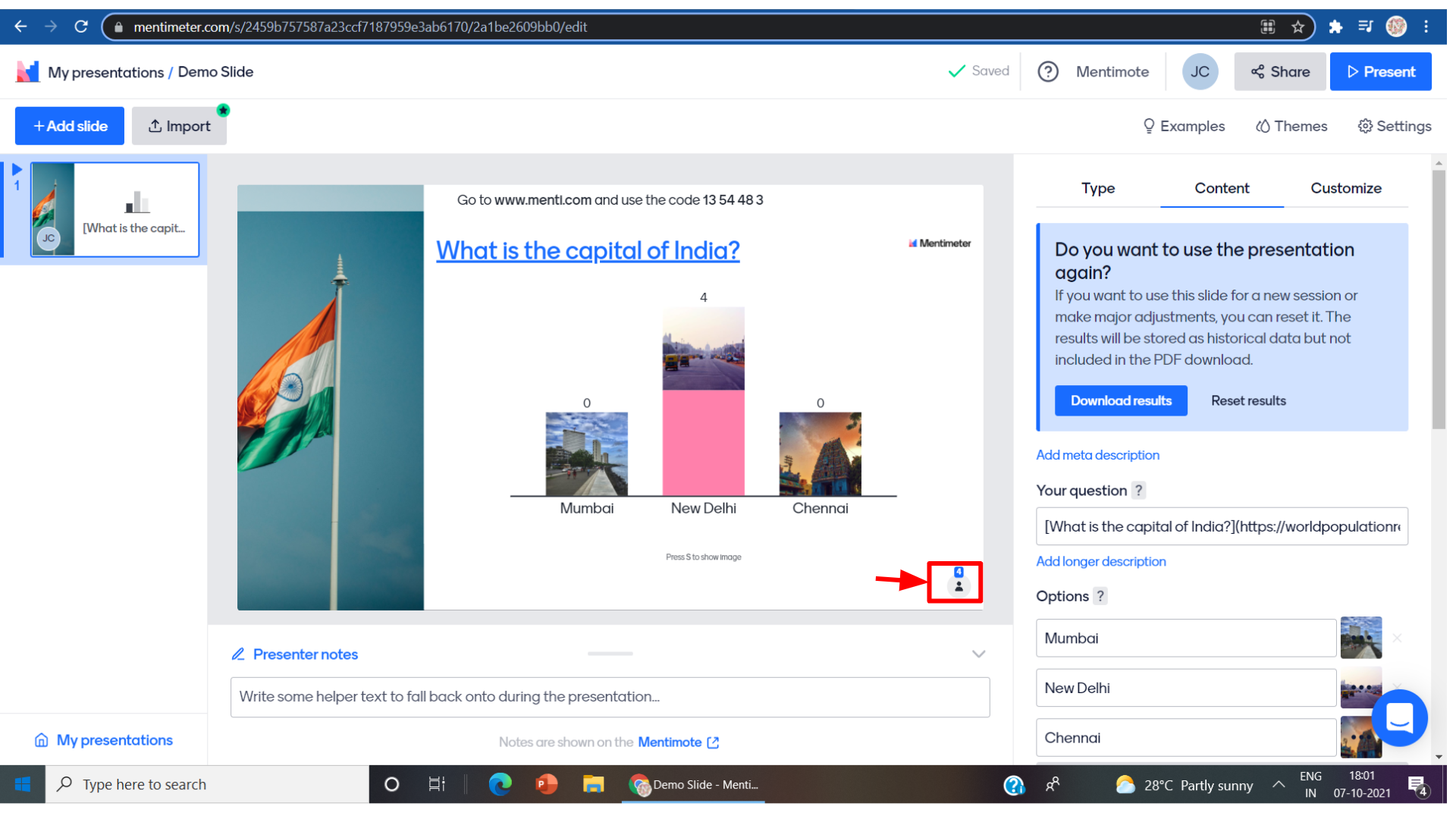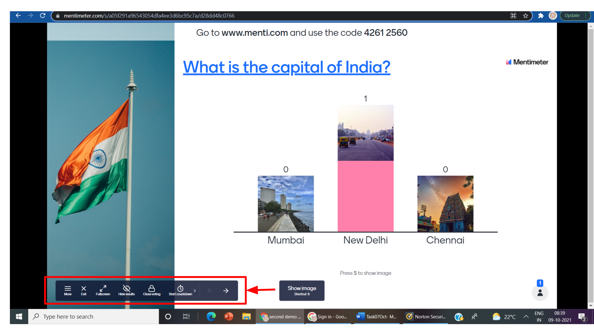 Now open the Mentimeter link in a new tab if you want to see how students will see this particular question. So they will see the image first then the question and then the options. They can select an option and click on the submit button to submit their answers.