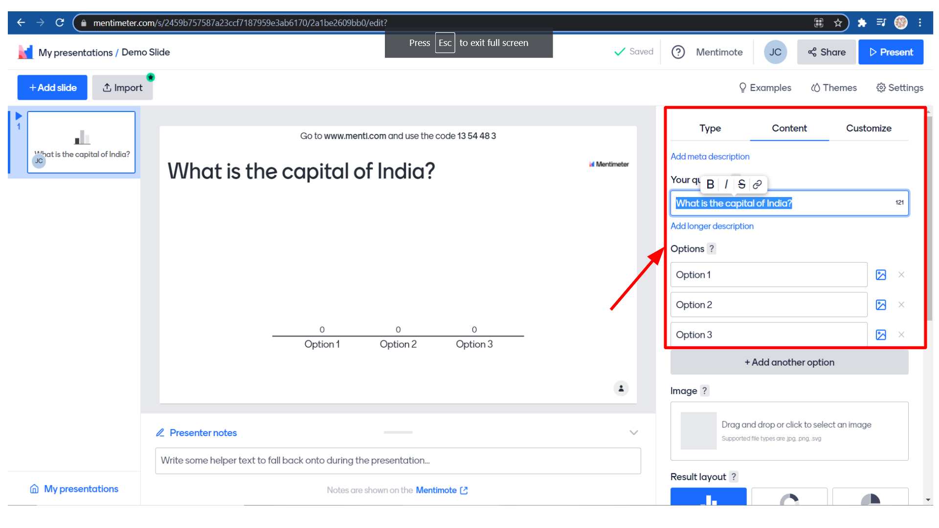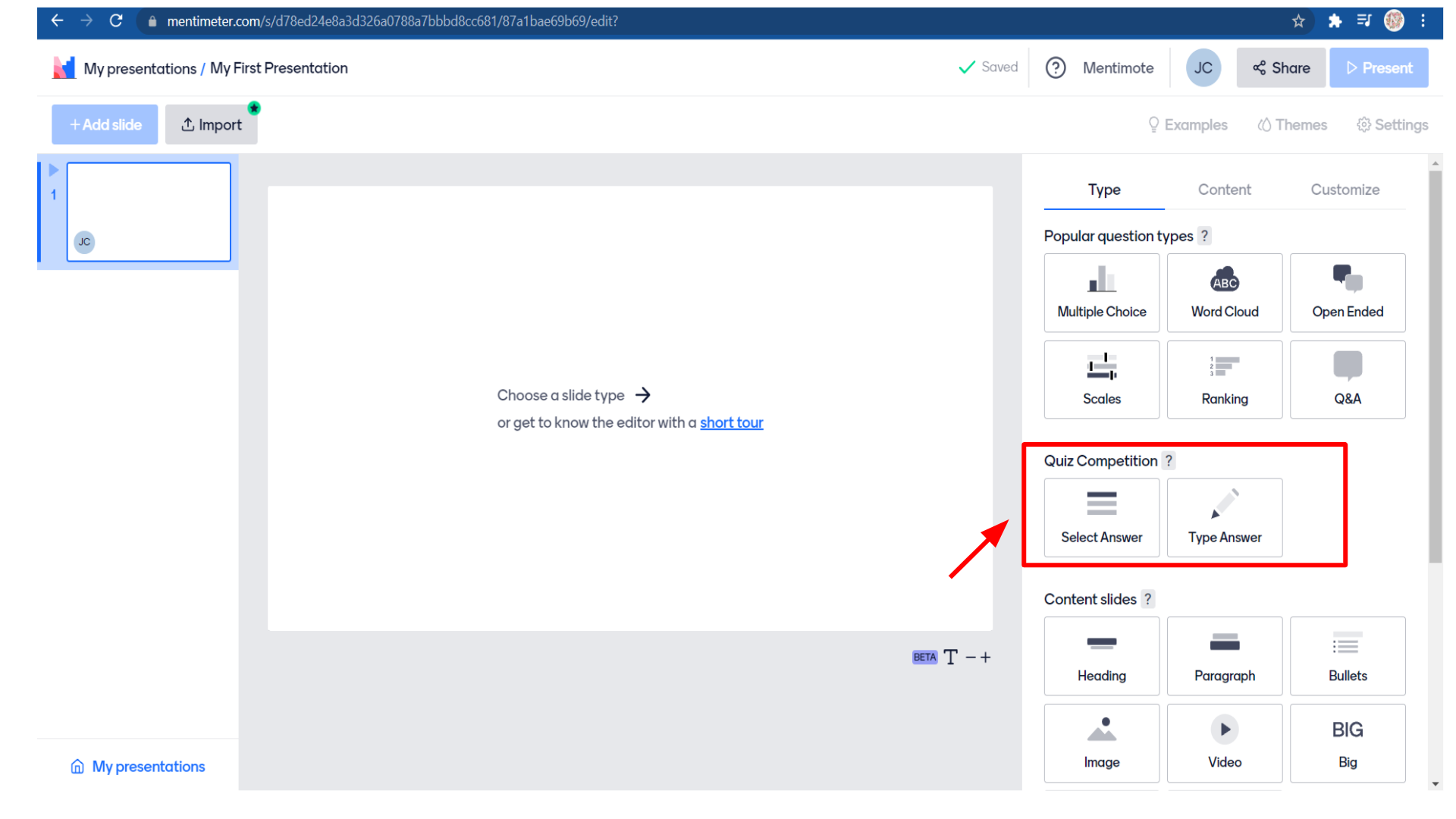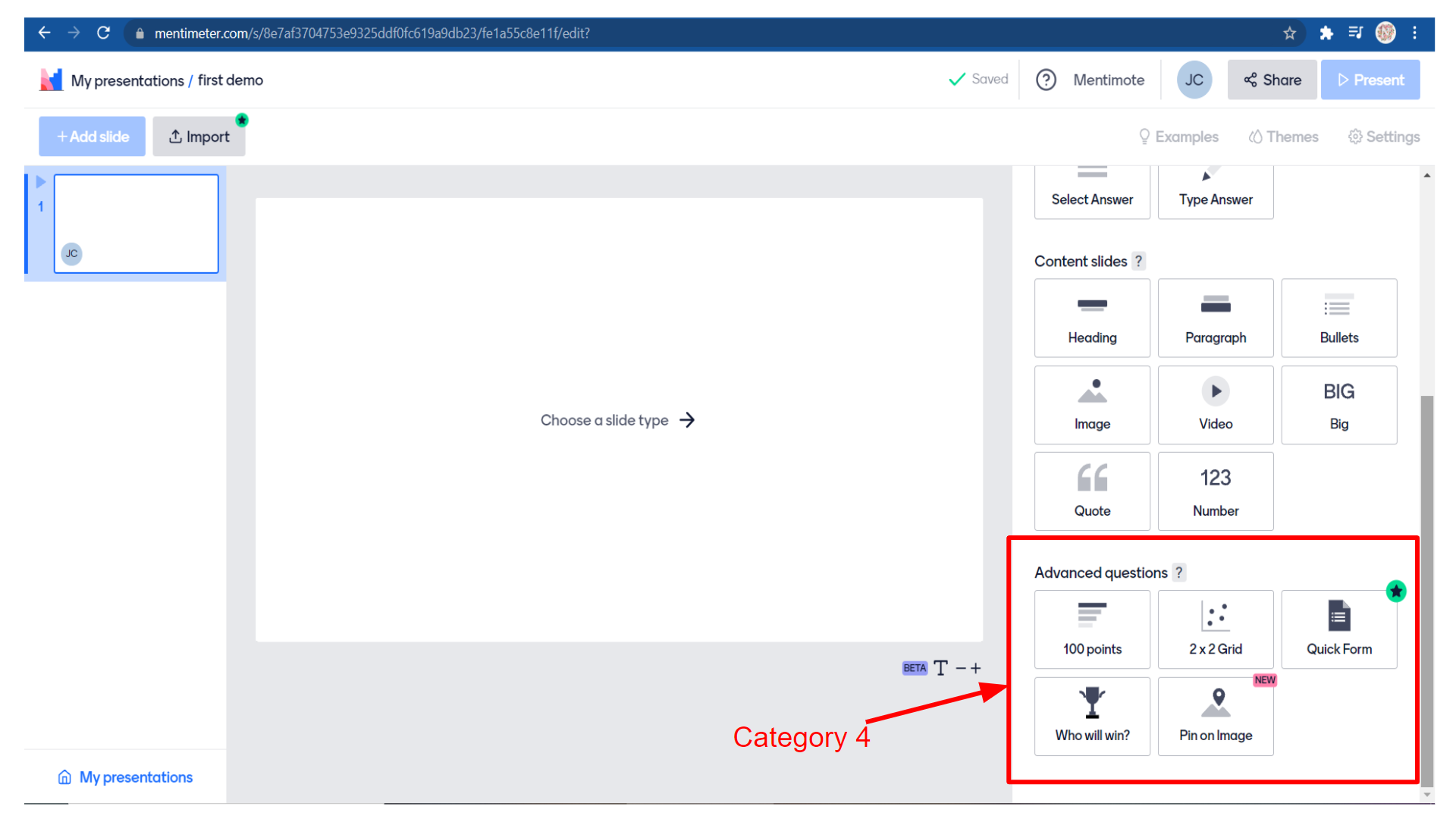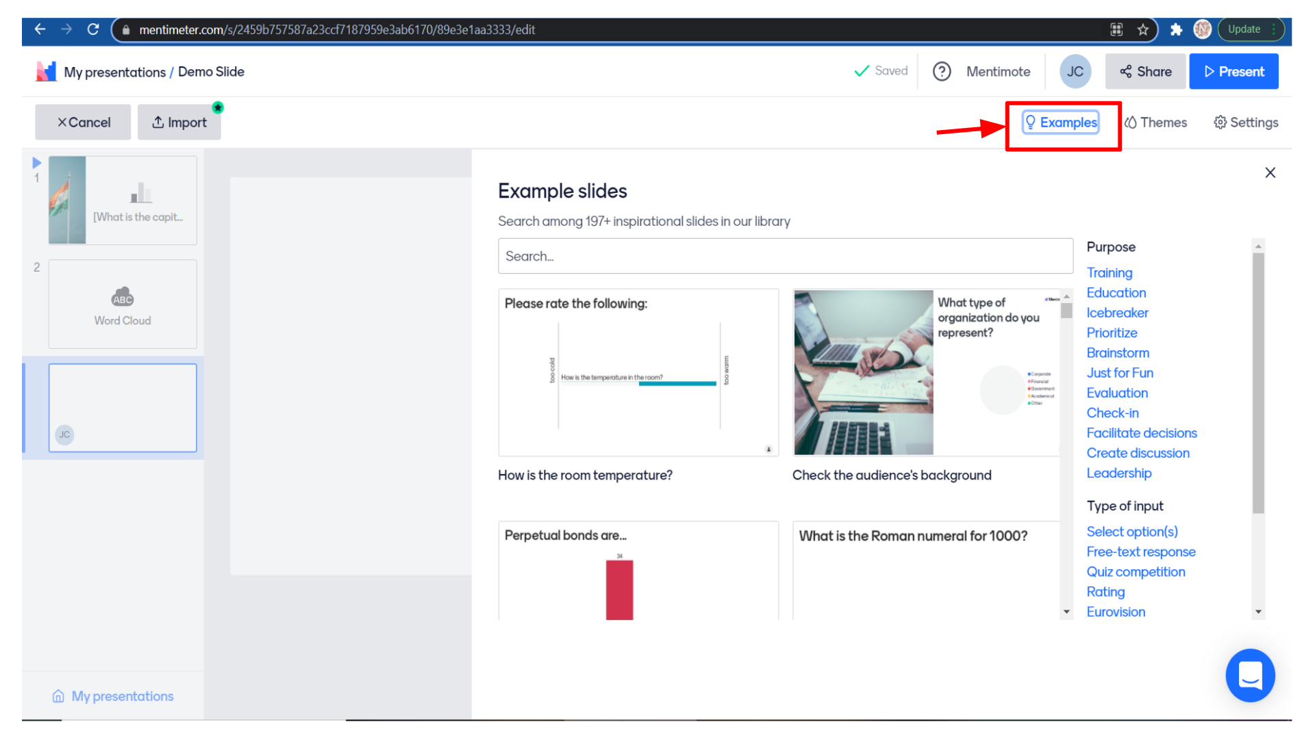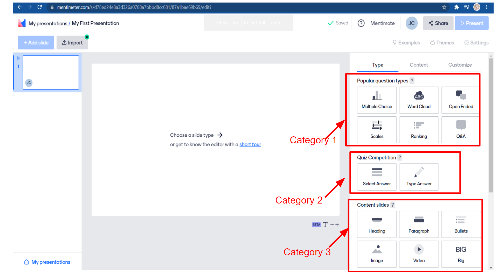 On the right side, you can see different types of features of Mentimeter, you can add these features based on your requirements. Under the “Type” menu, it is categorized into 4. They are: