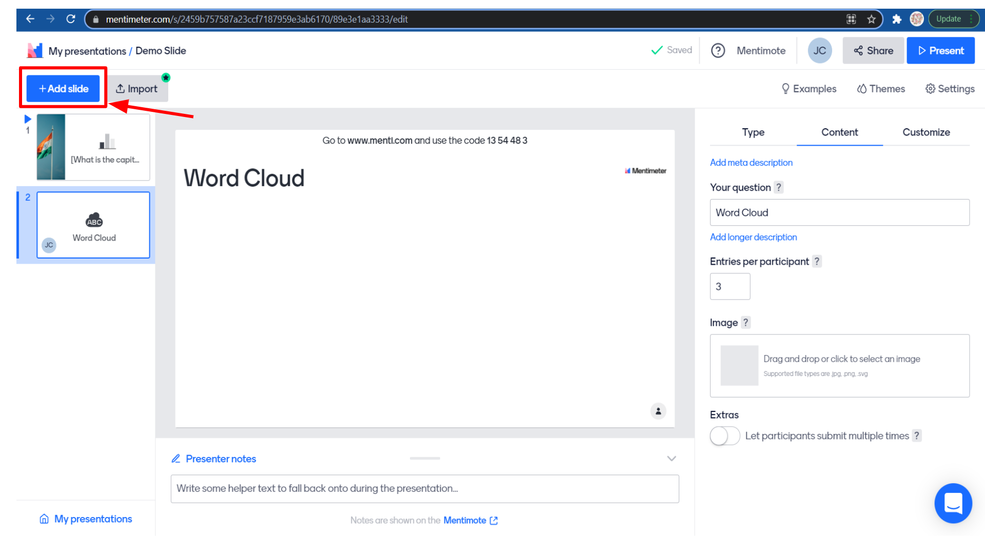If you select the word cloud type and the content will be according to which type of question slide we added.