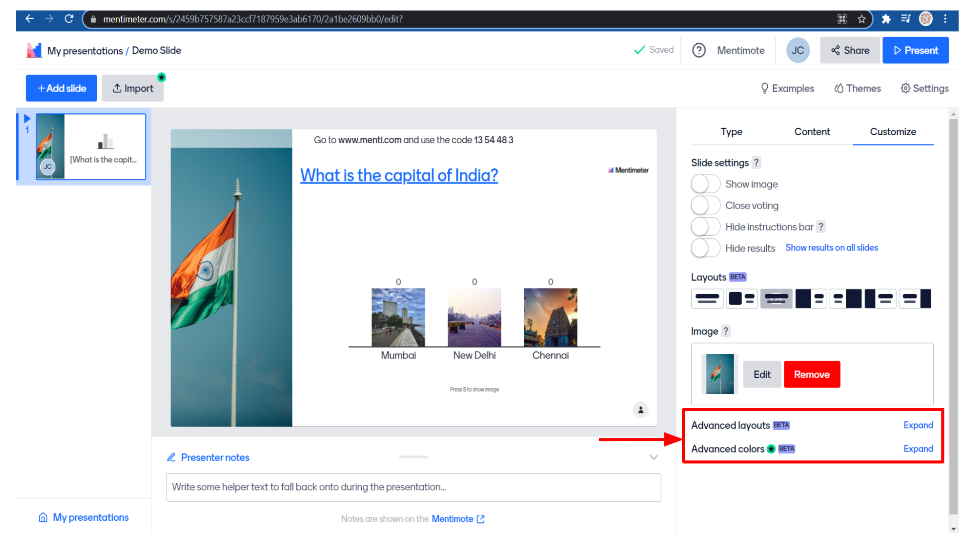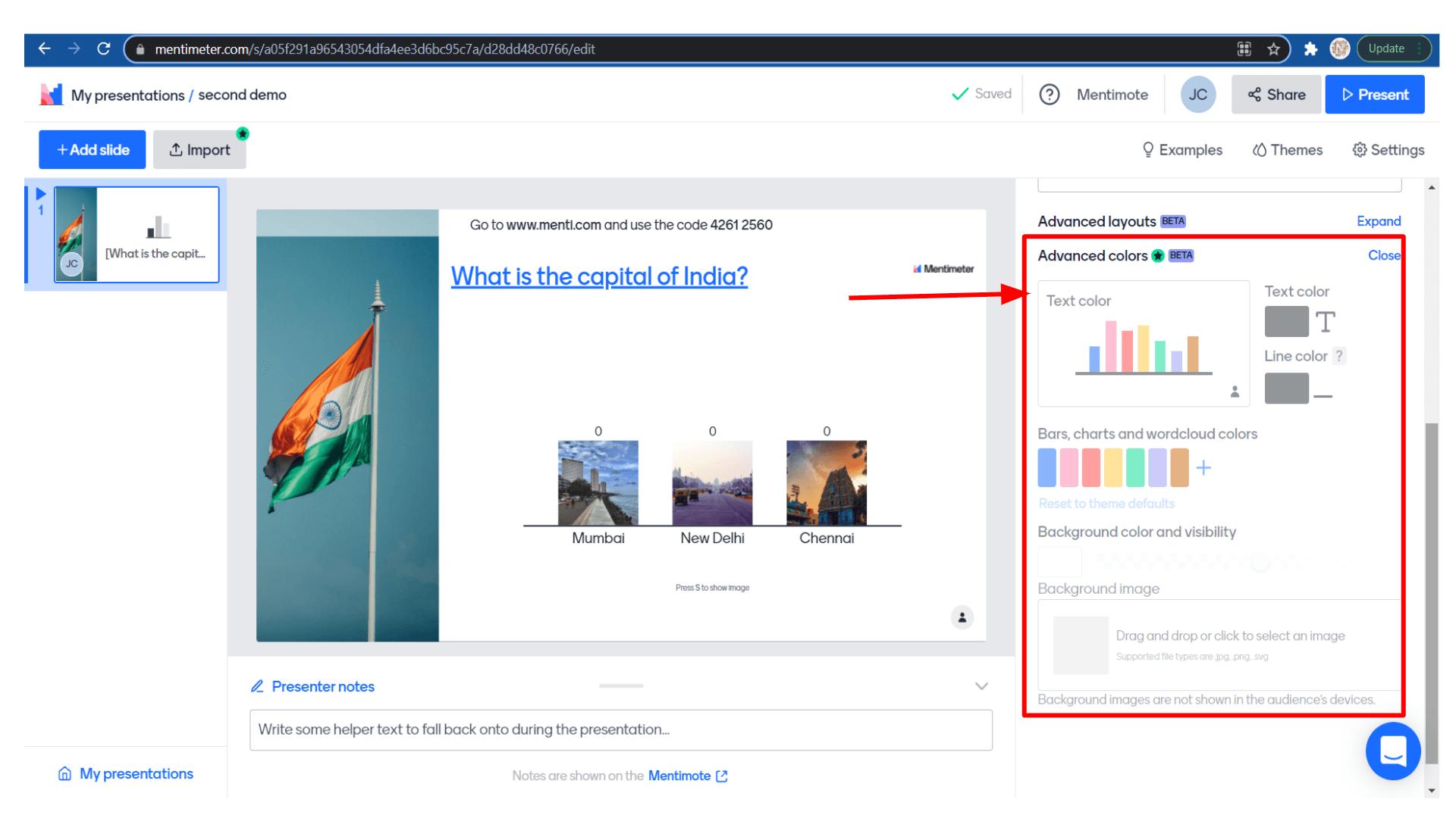 The advanced colours option is a pro element you have to upgrade your Mentimeter account to access this feature.