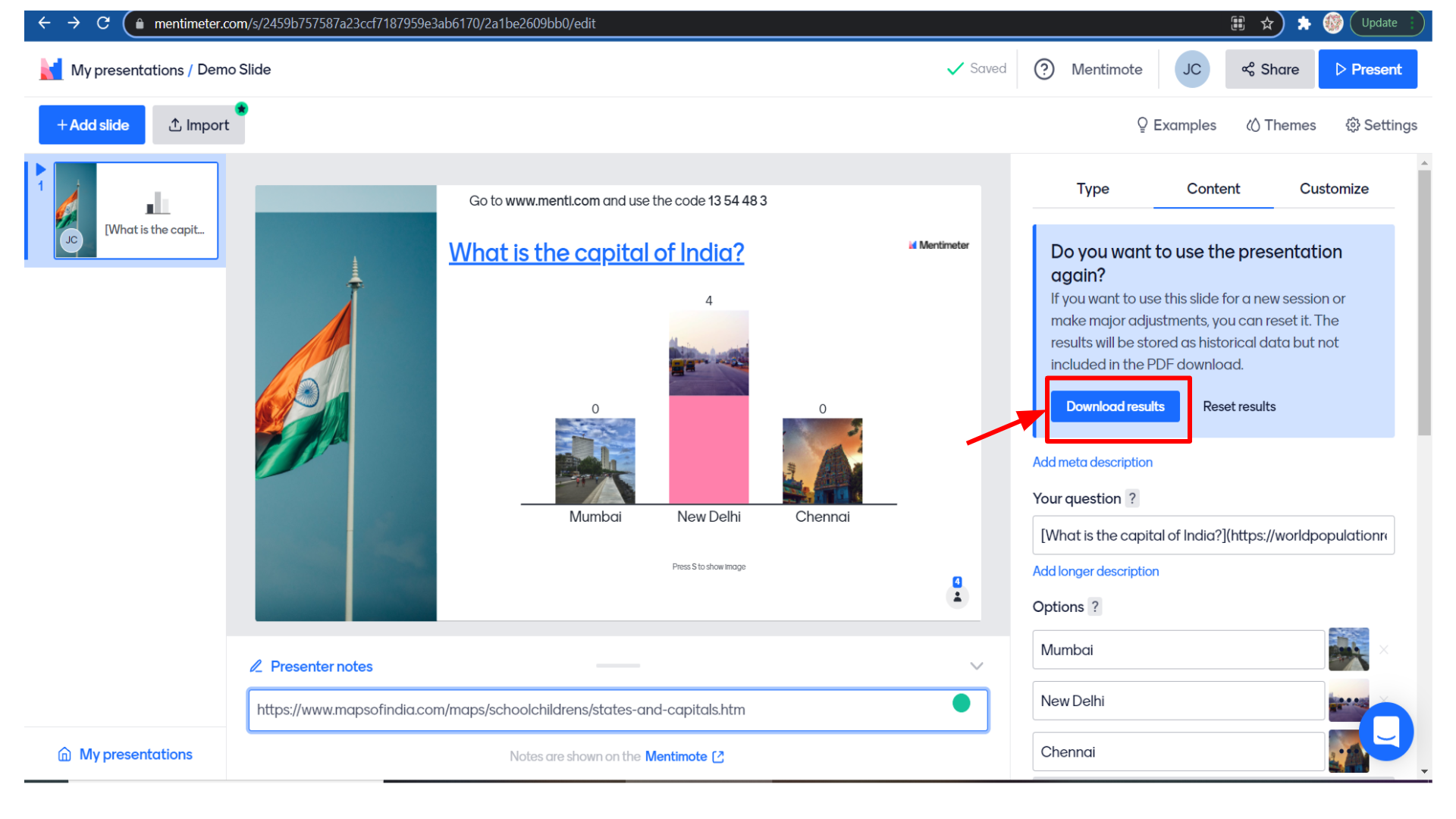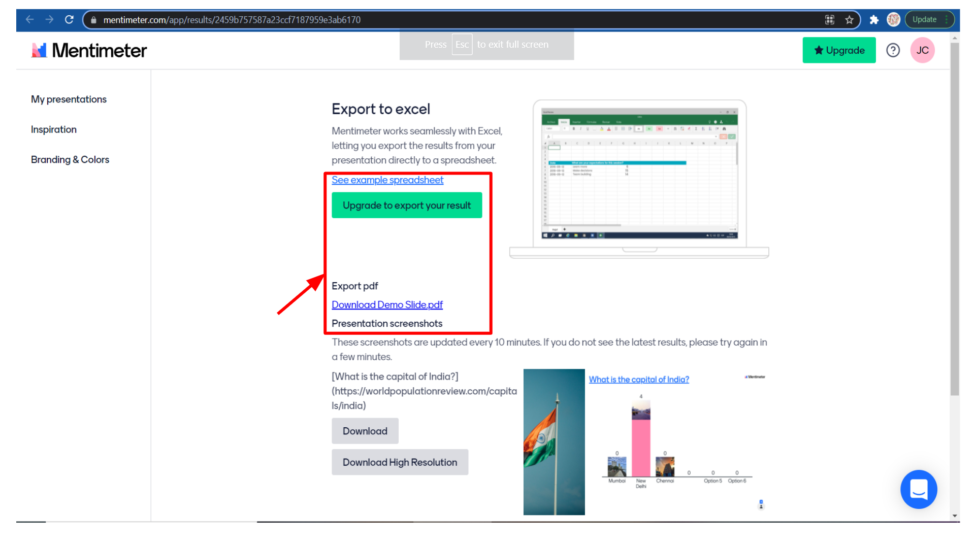To download it as an excel sheet, you will have to upgrade your Mentimeter account but you can download it as a pdf or as screenshots in the free account itself.