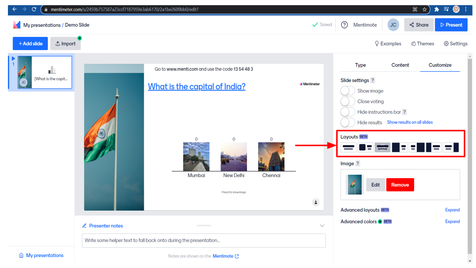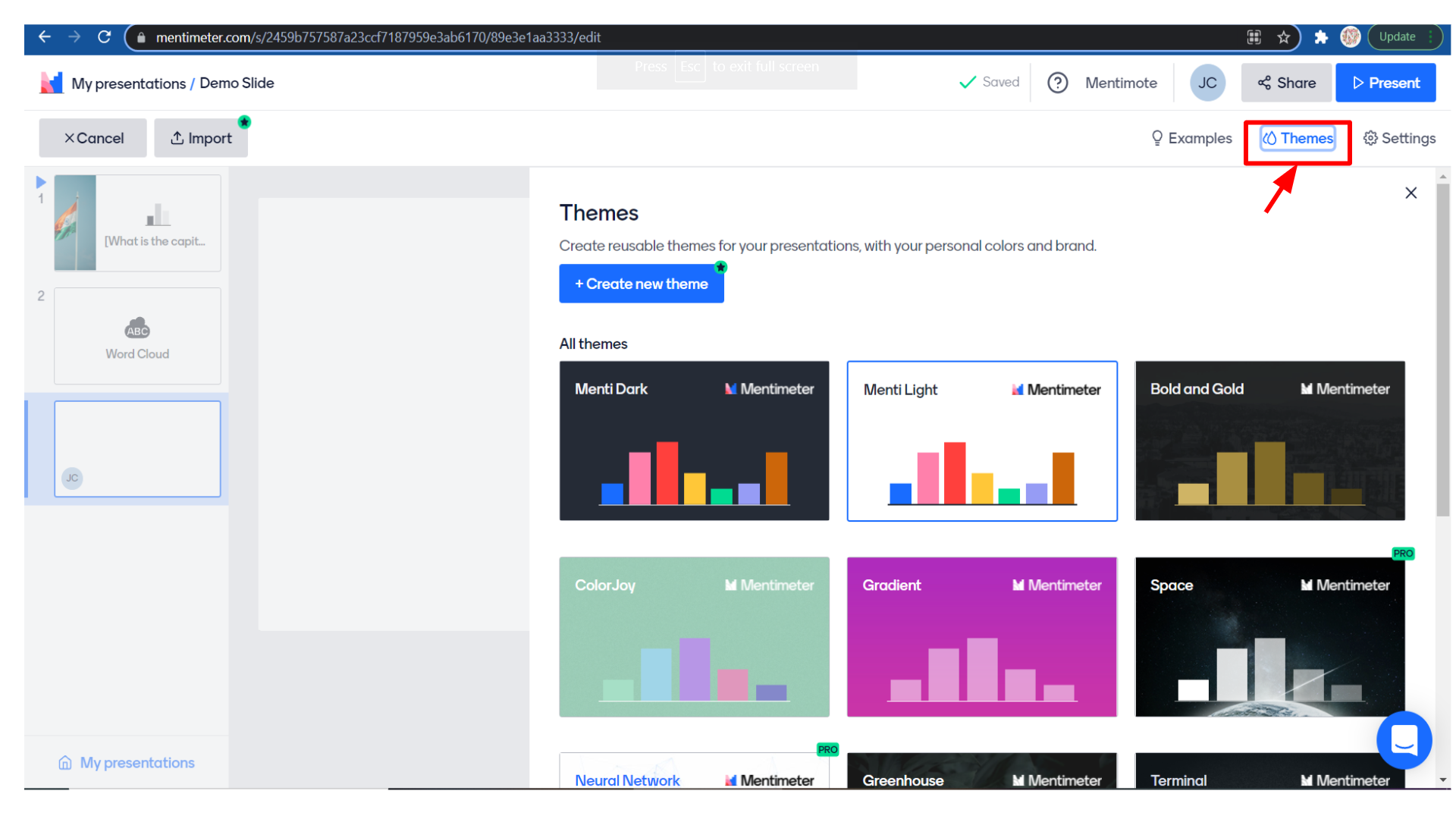 Now let's try creating our first presentation on Mentimeter. On the right-hand side of the screen, you can see many options to design your presentation and make it interactive.