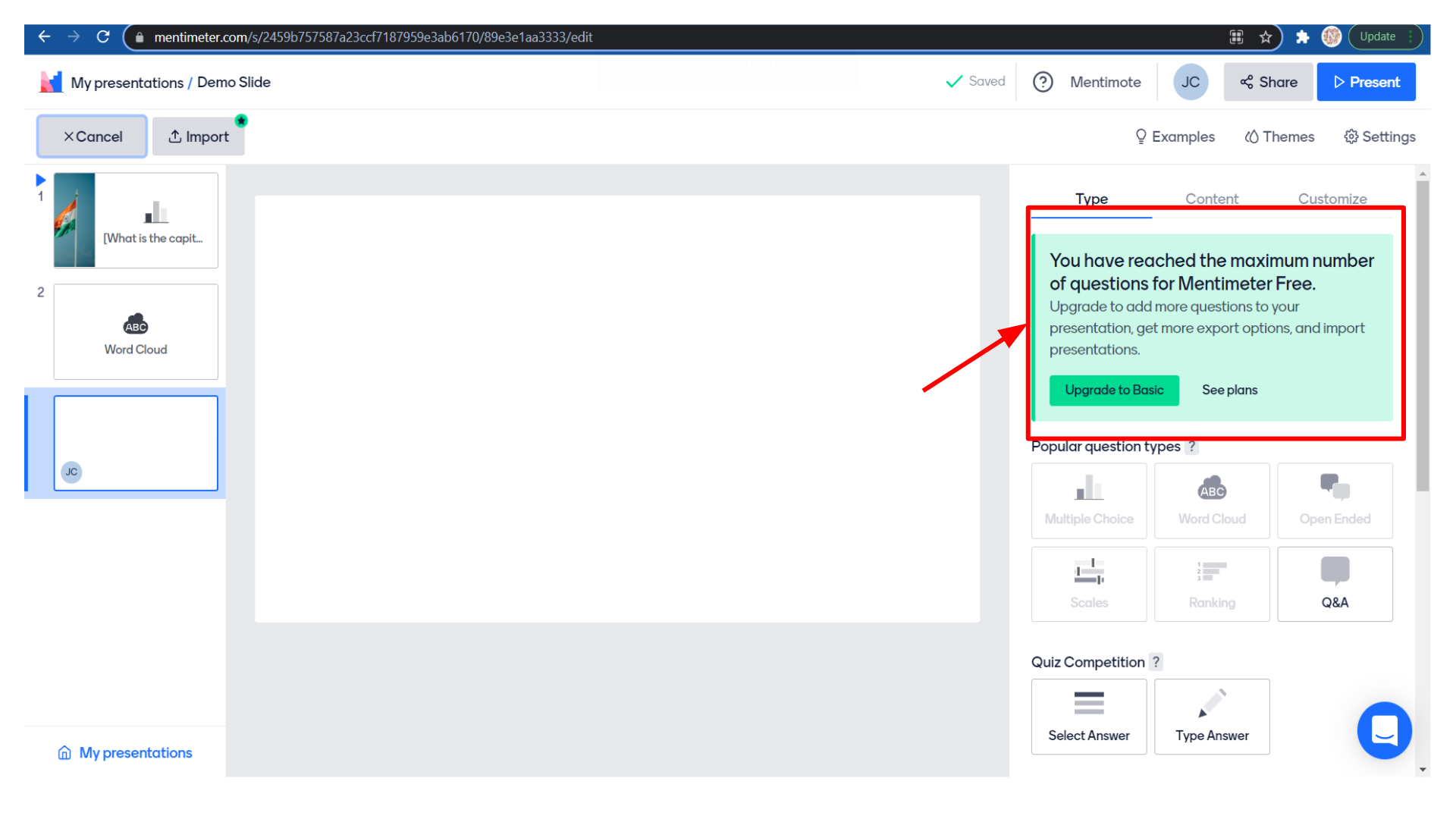Try adding one more slide and now you will see that they are asking you to upgrade your account this is because in the free account you can create only up to two question slides and five quiz slides