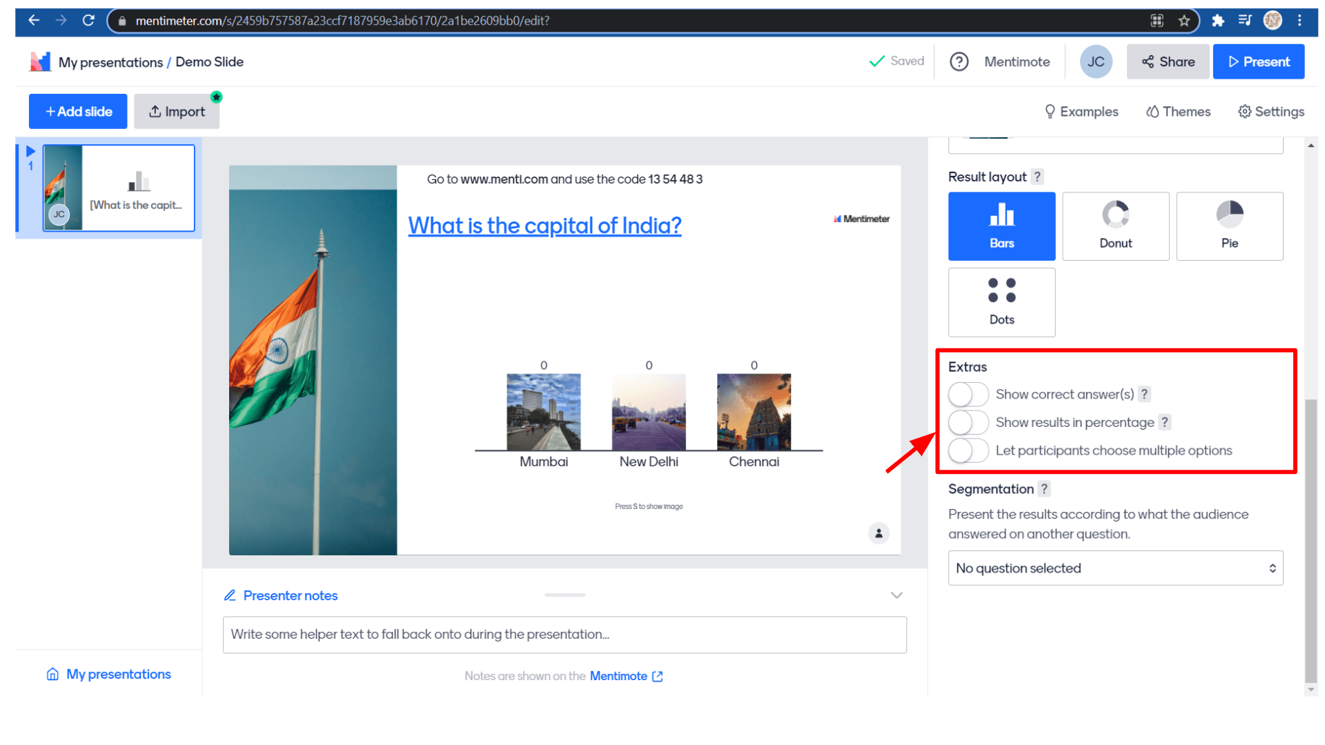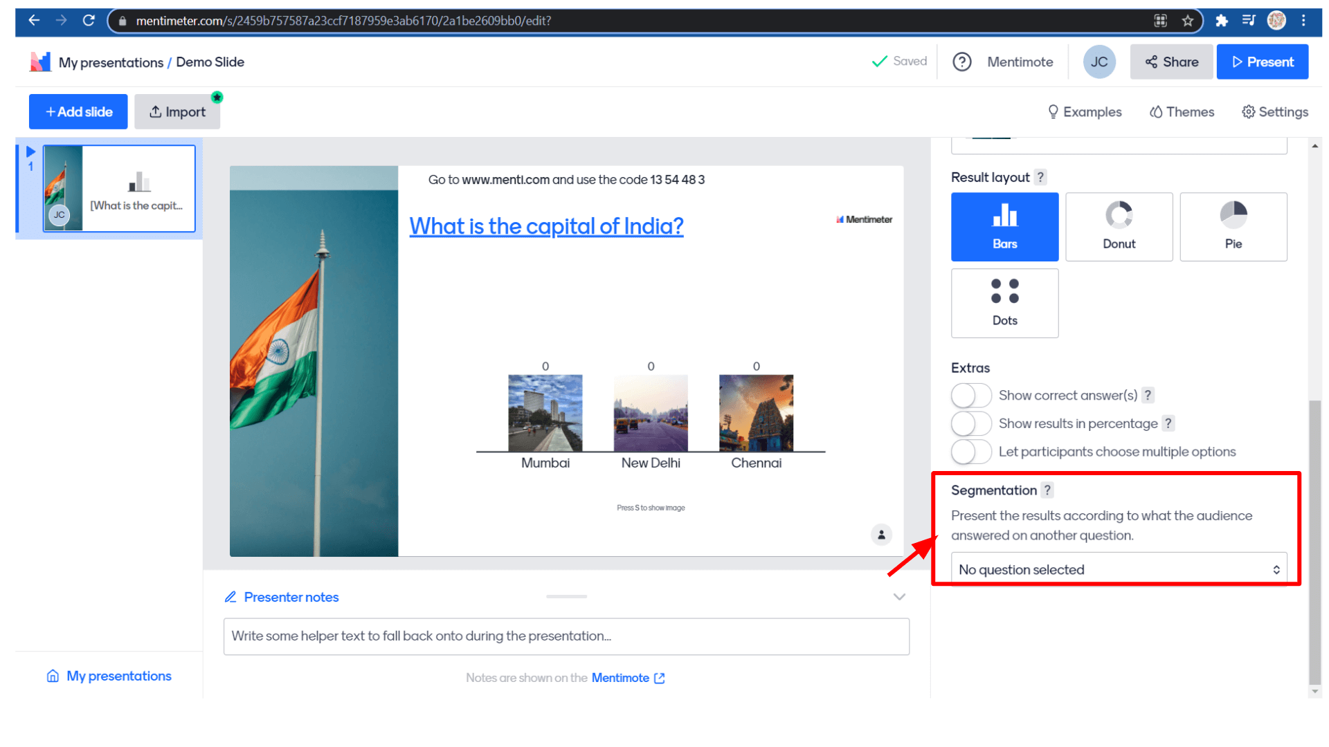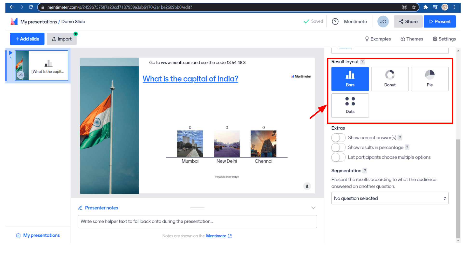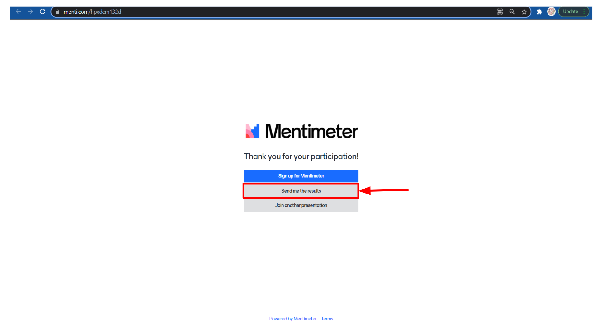Both ‘audience pace’ or ‘presenter pace’ can be set in the Mentimeter.