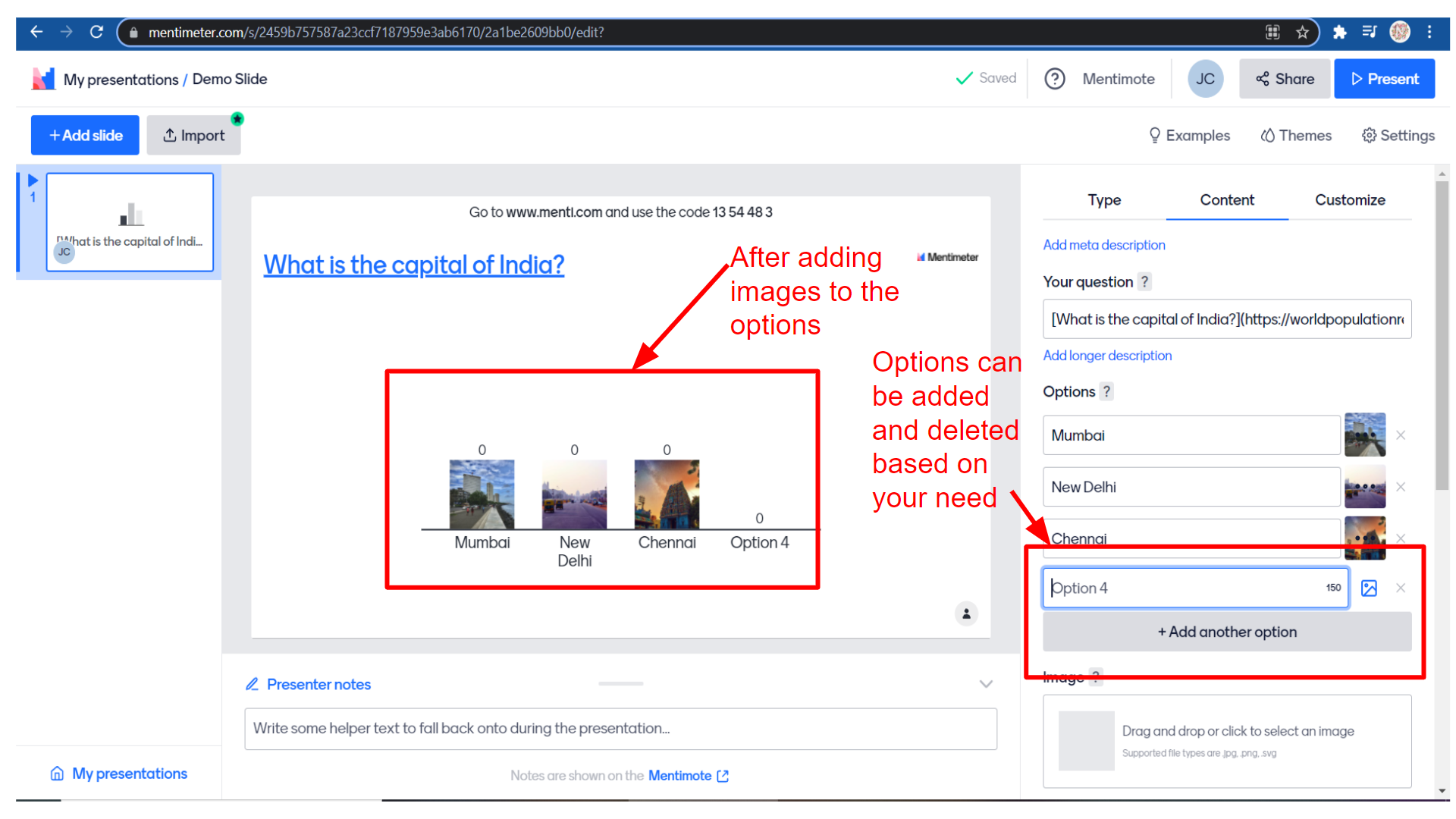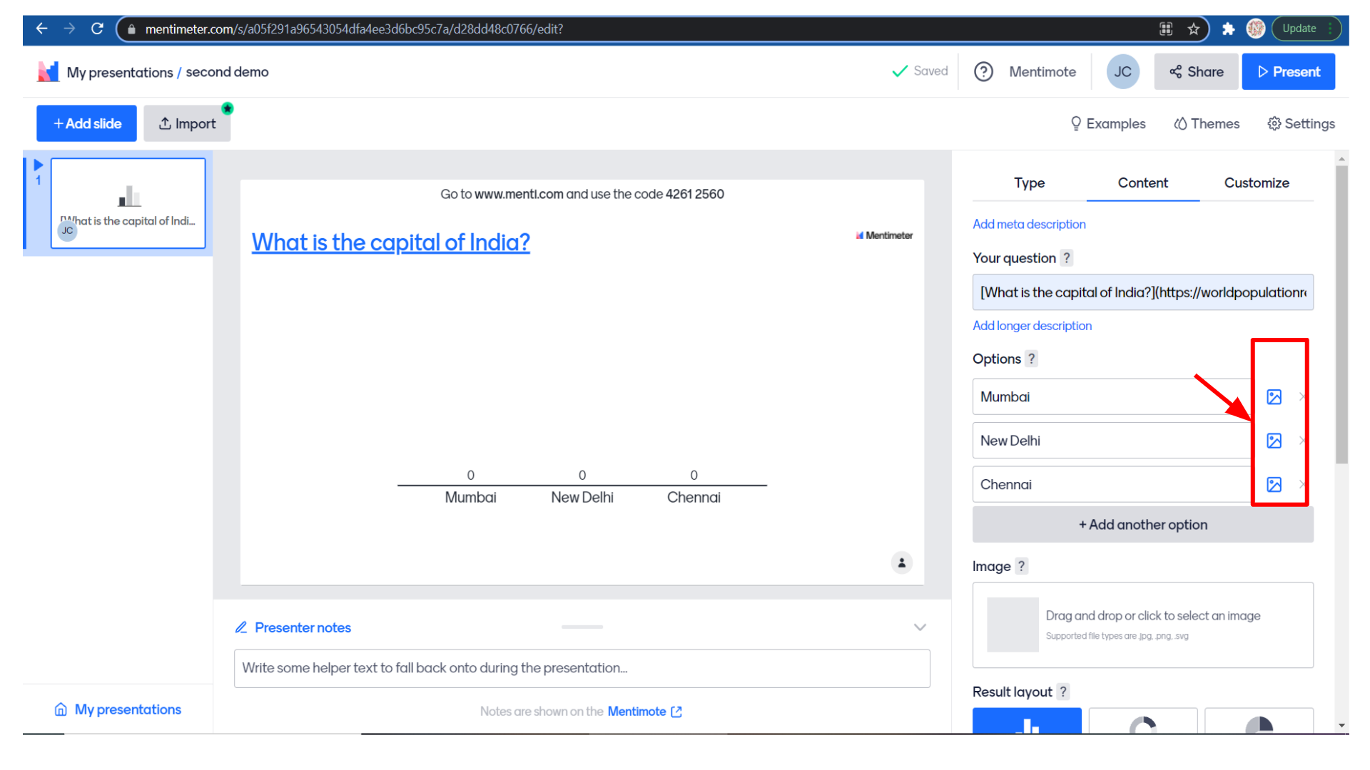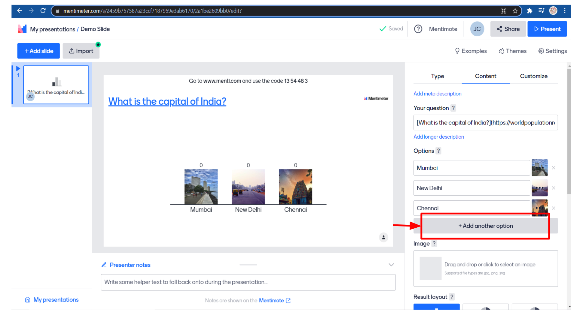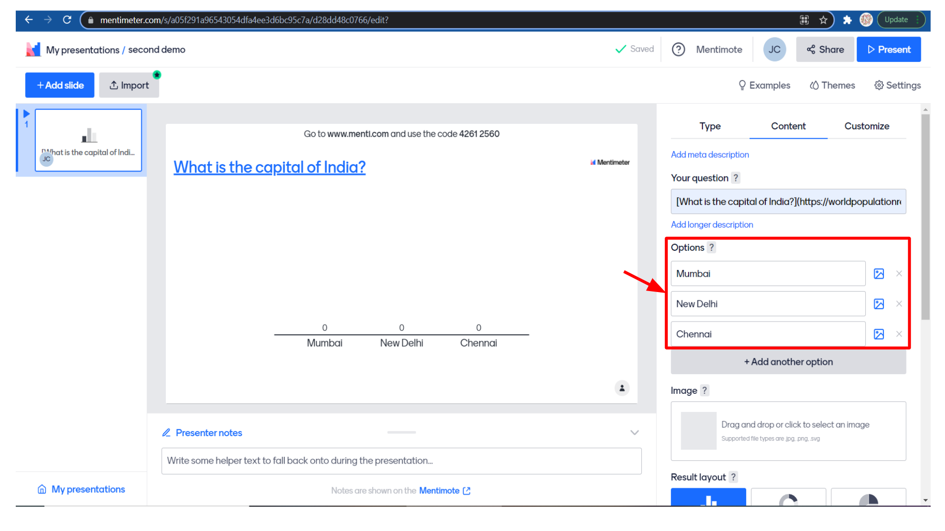 Now the next one is adding options to the question. You can give different options. I’m adding Mumbai, New Delhi, and Chennai as options.
