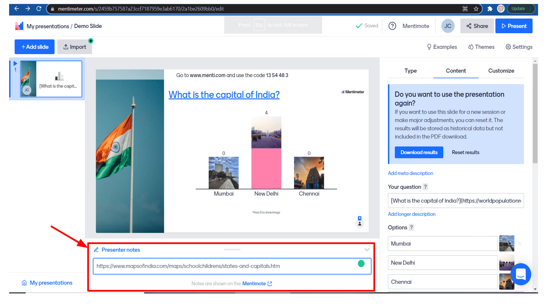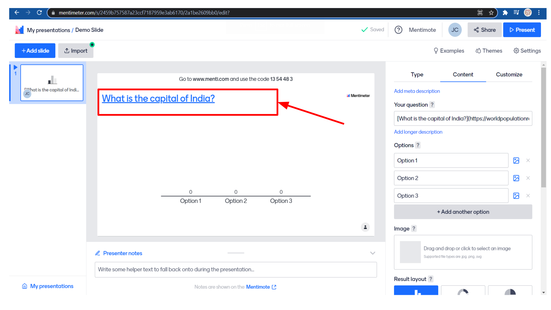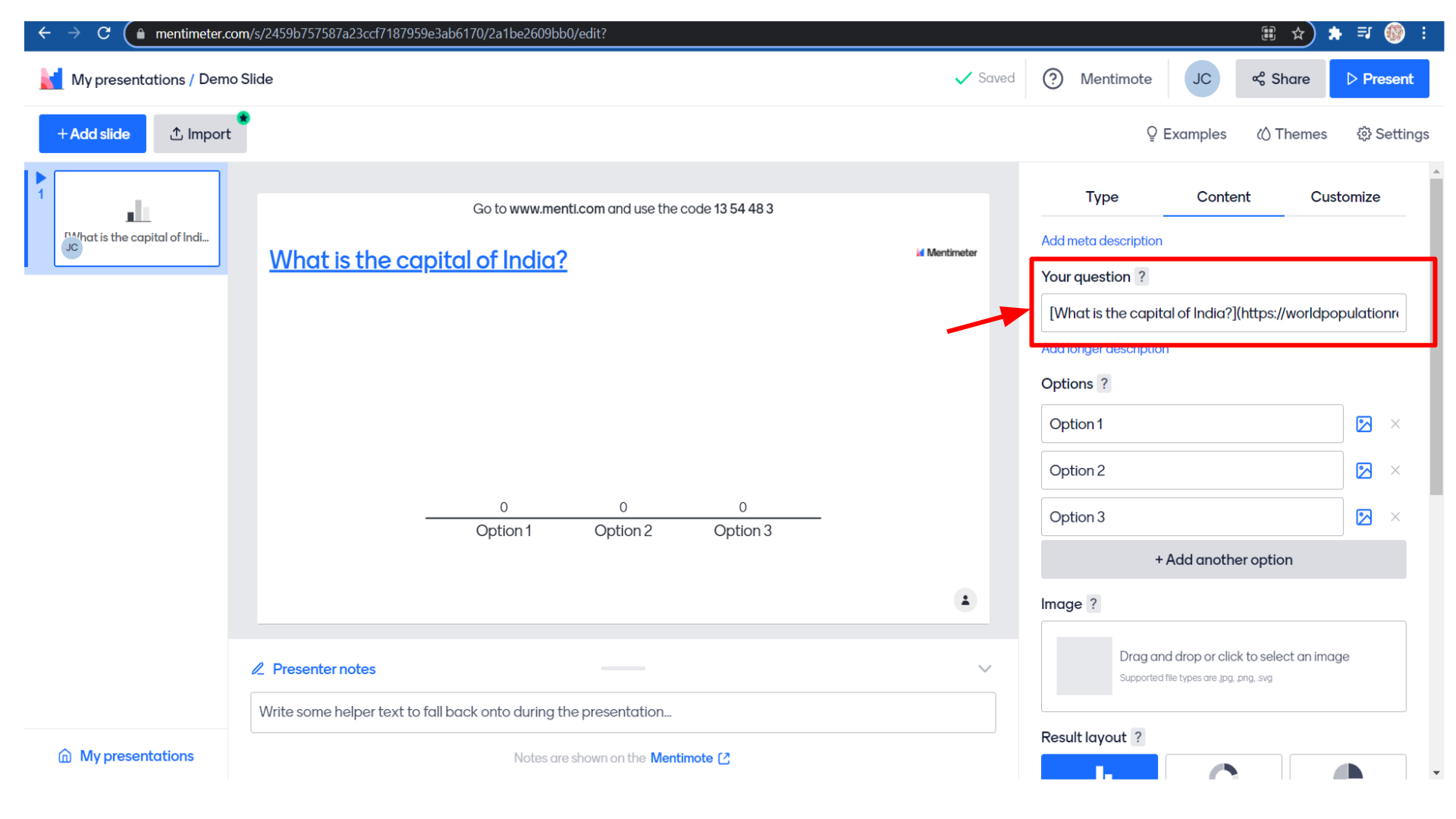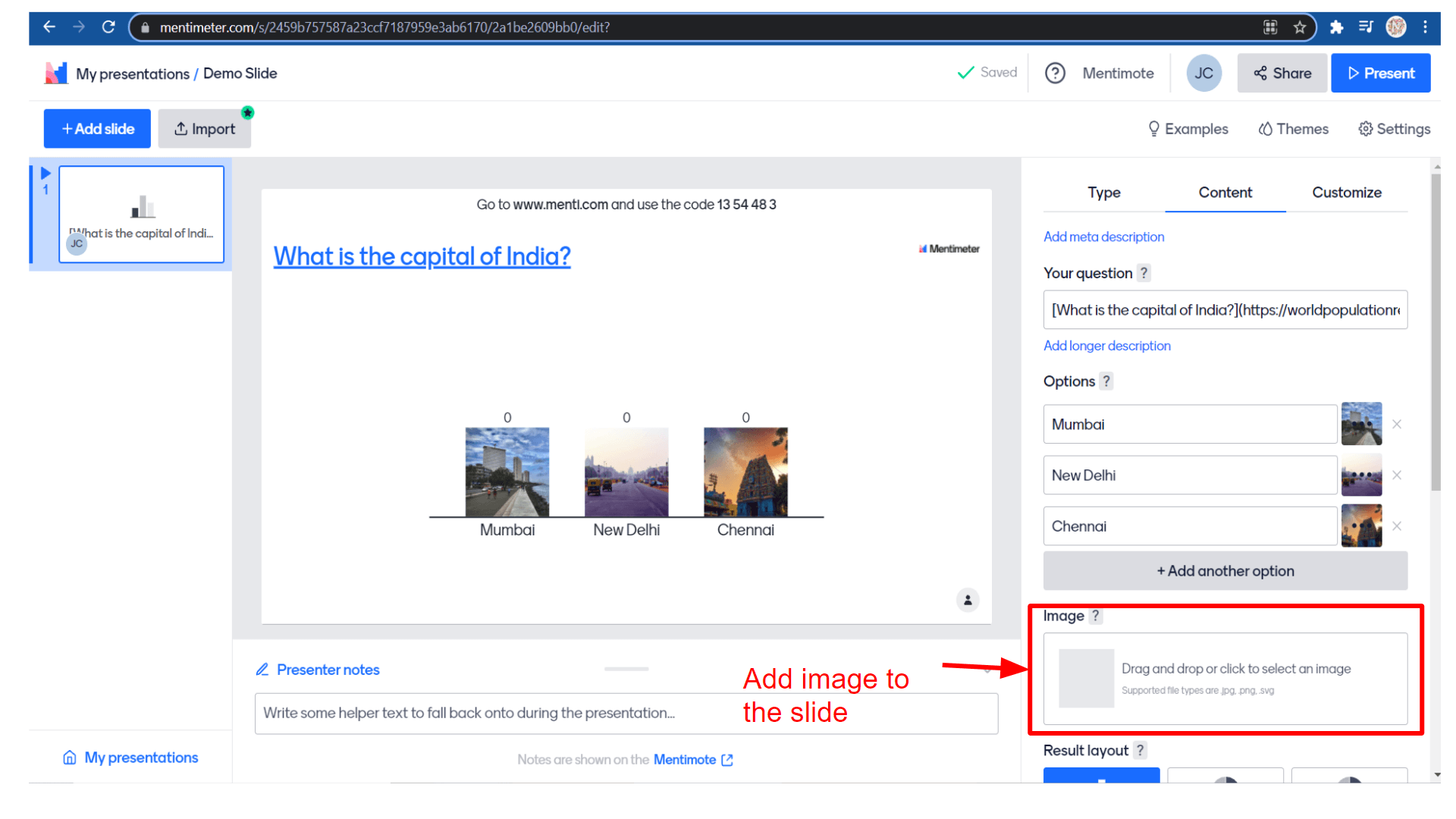 Now the next one is adding options to the question. You can give different options. I’m adding Mumbai, New Delhi, and Chennai as options.