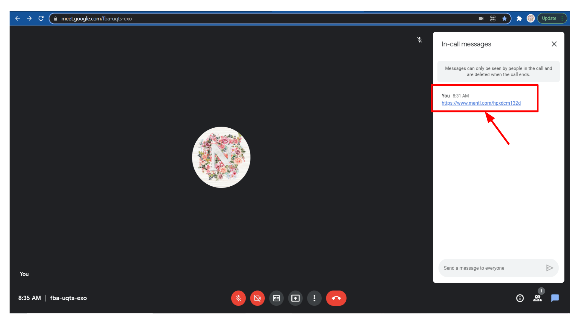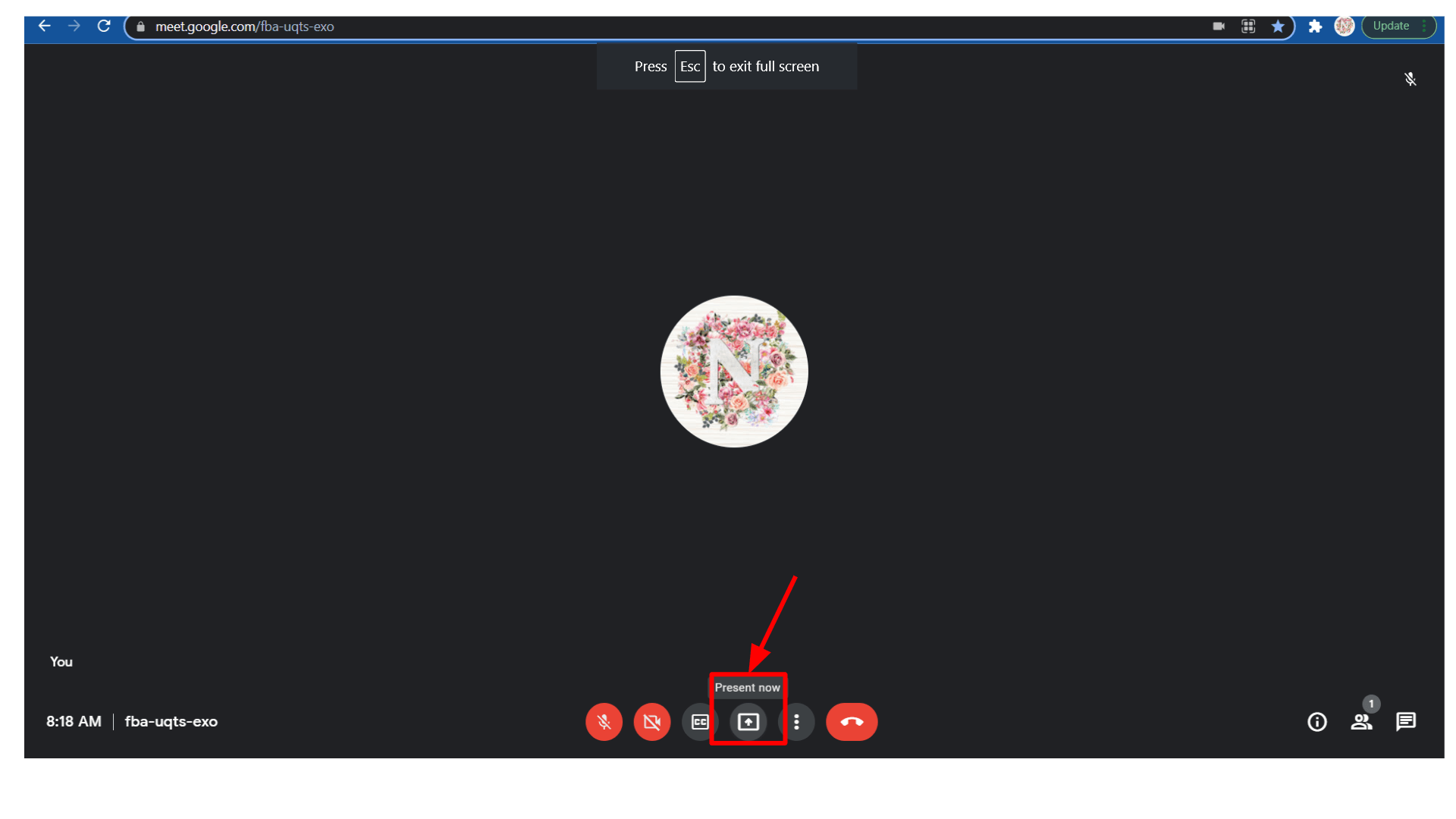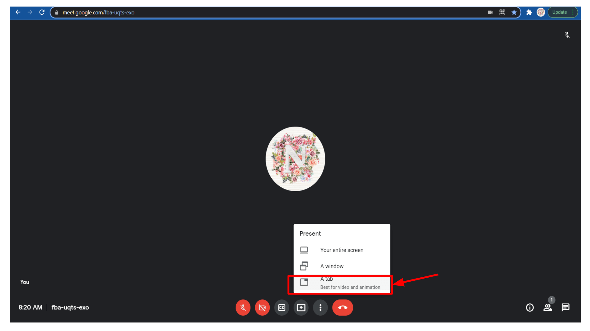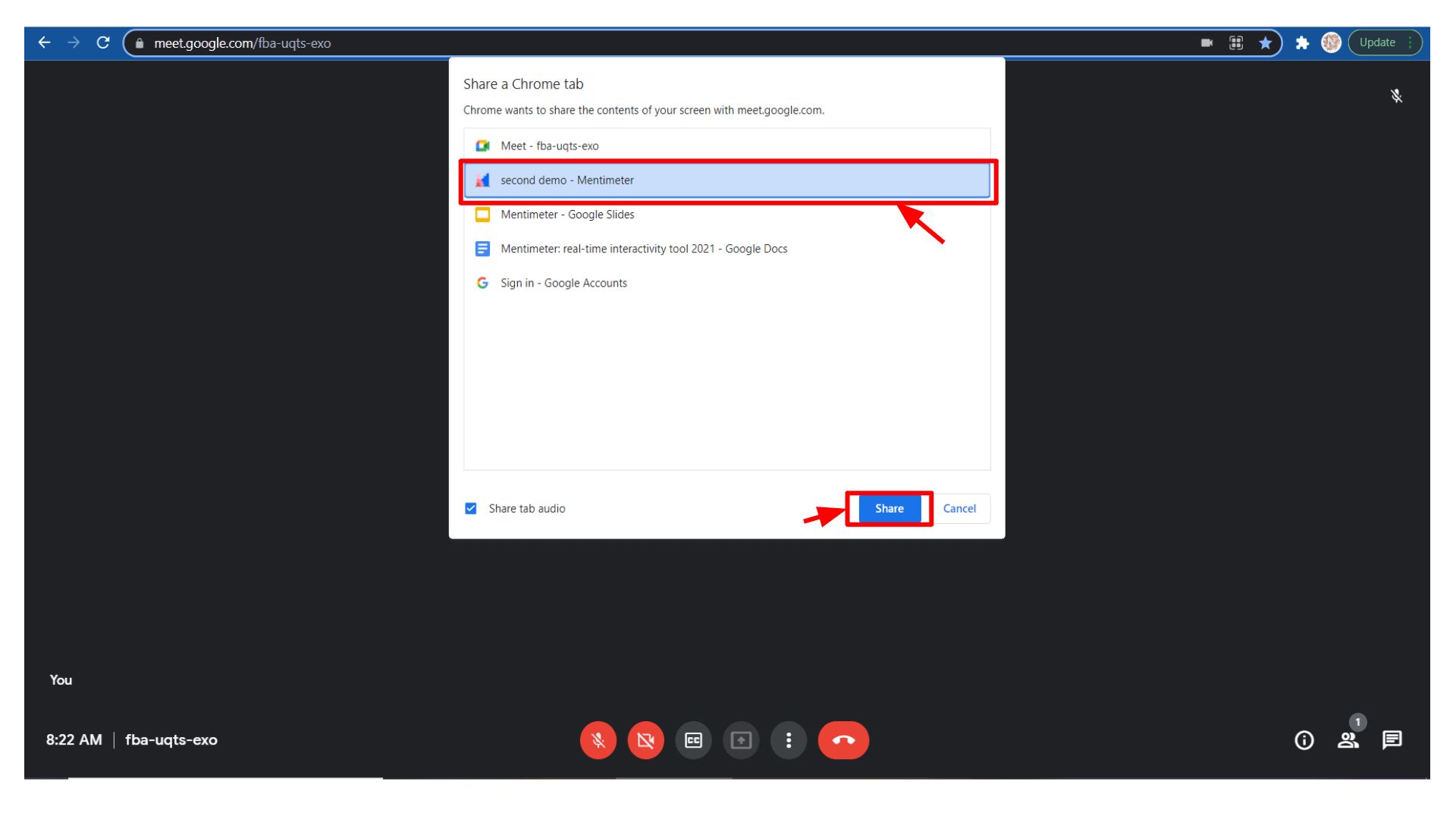 Now we are sharing the selected tab to google meet, then click on the “share” button