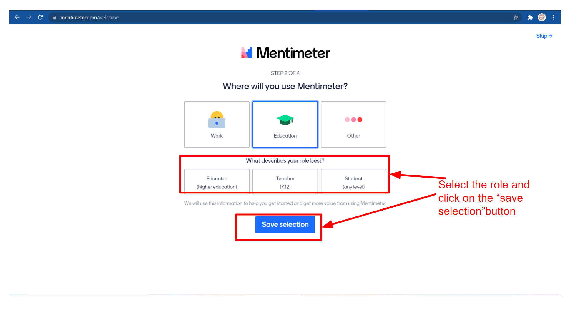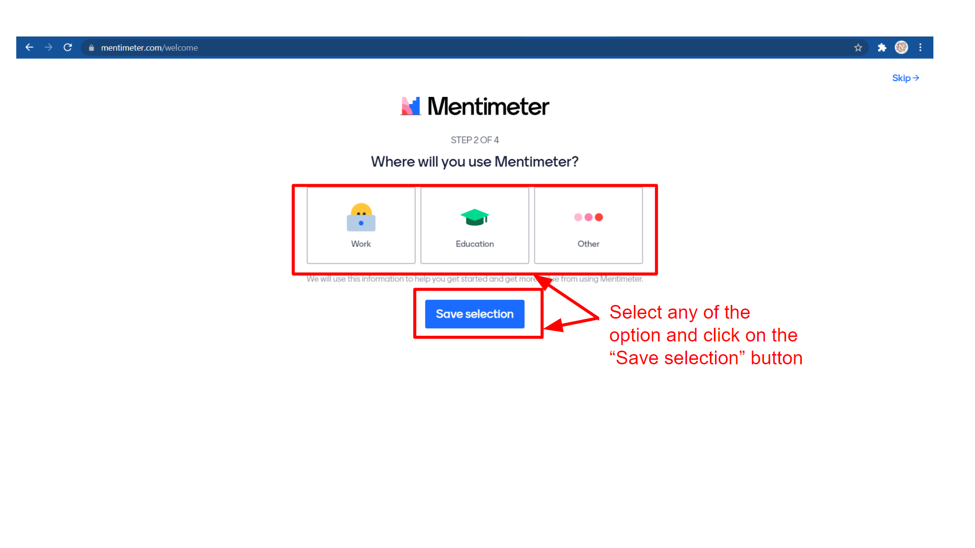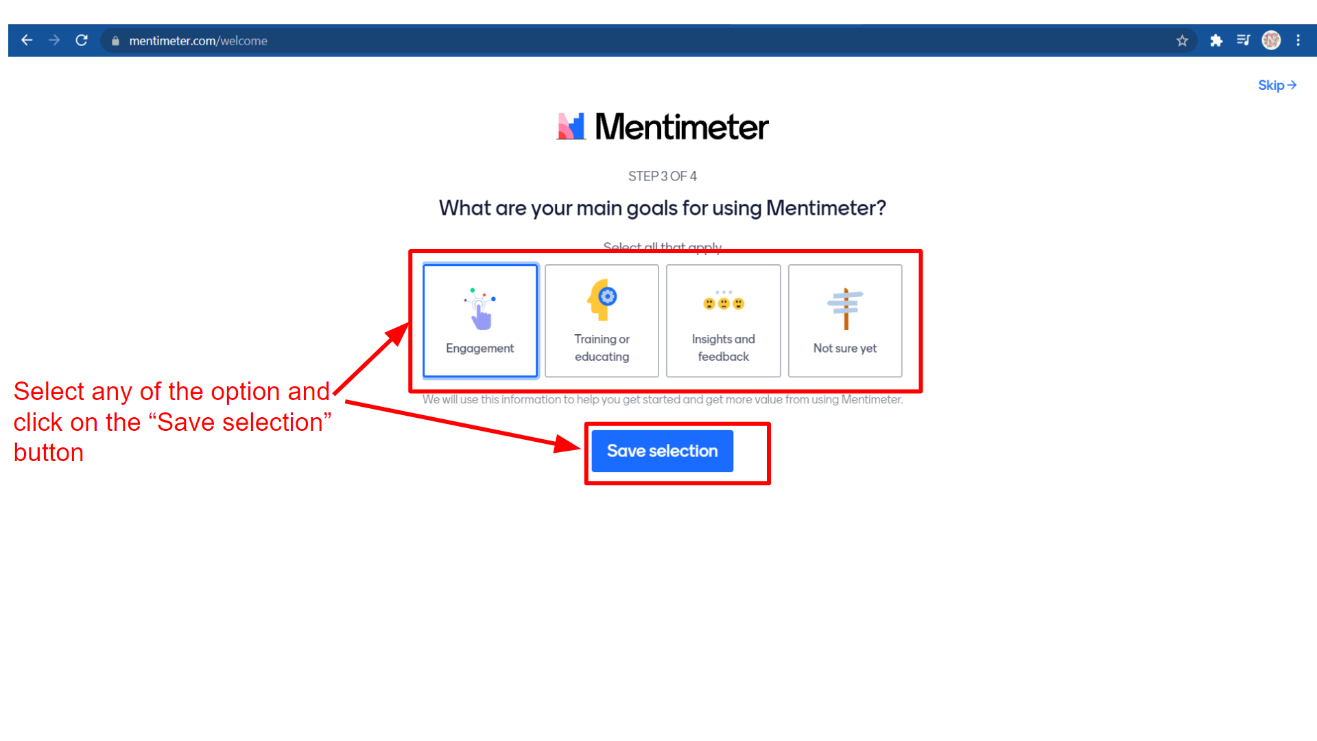 Step 3: Next You may choose your goals for using Mentimeter. You may choose “Engagement” and click on the “Save selection” button.