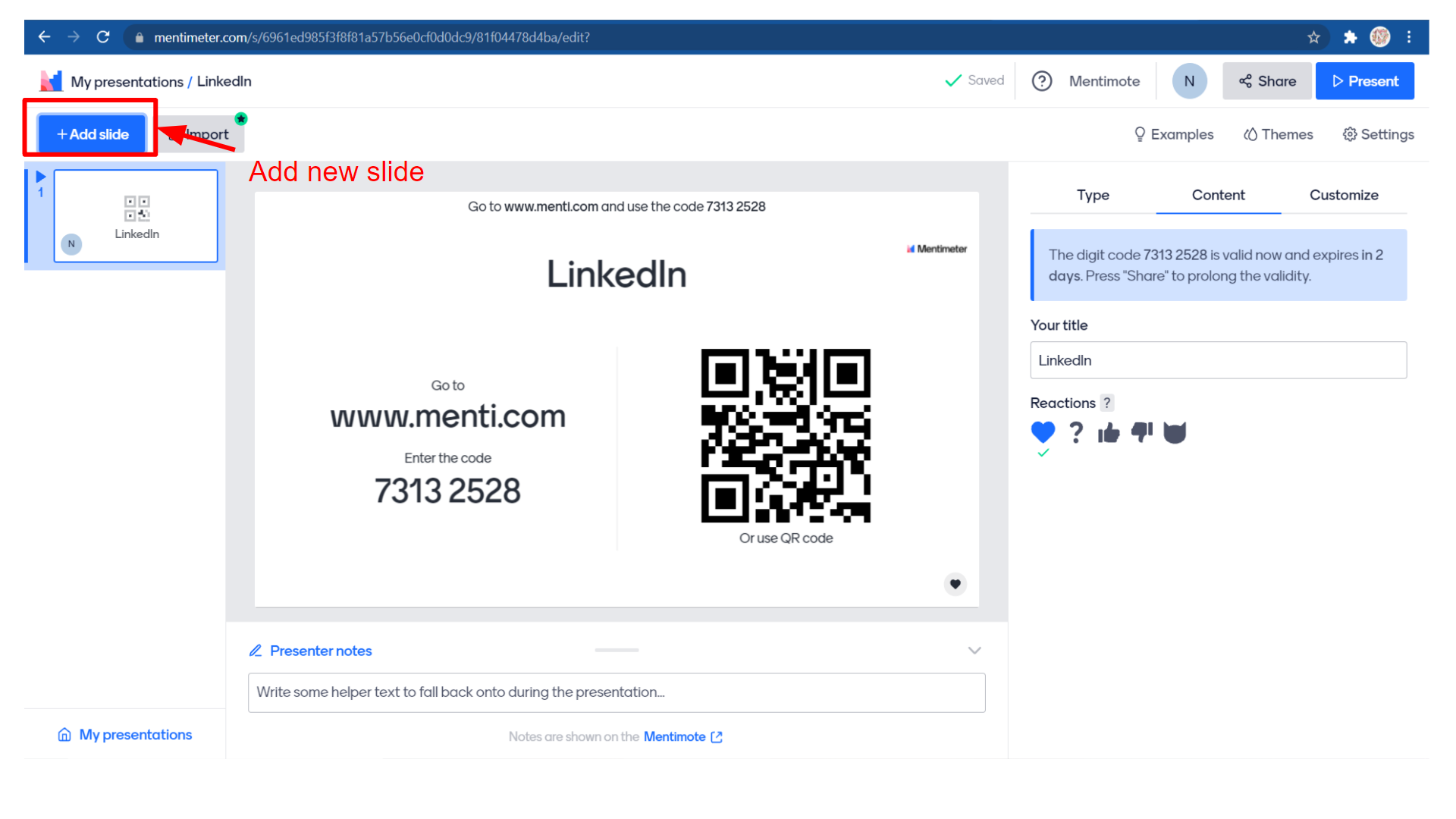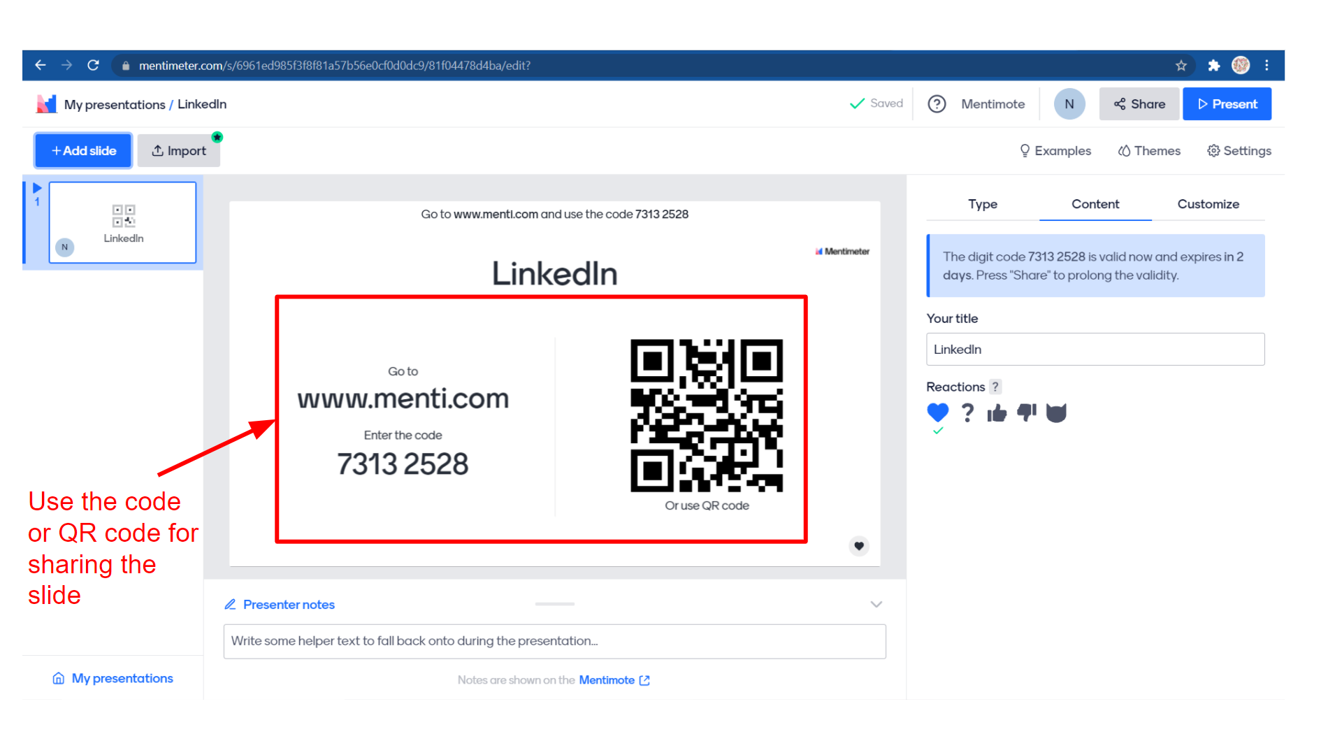 Then you get a slide with a code number and QR code bar, this code should be shared with other persons during the presentation. This is one of the options to share the presentation with other persons.