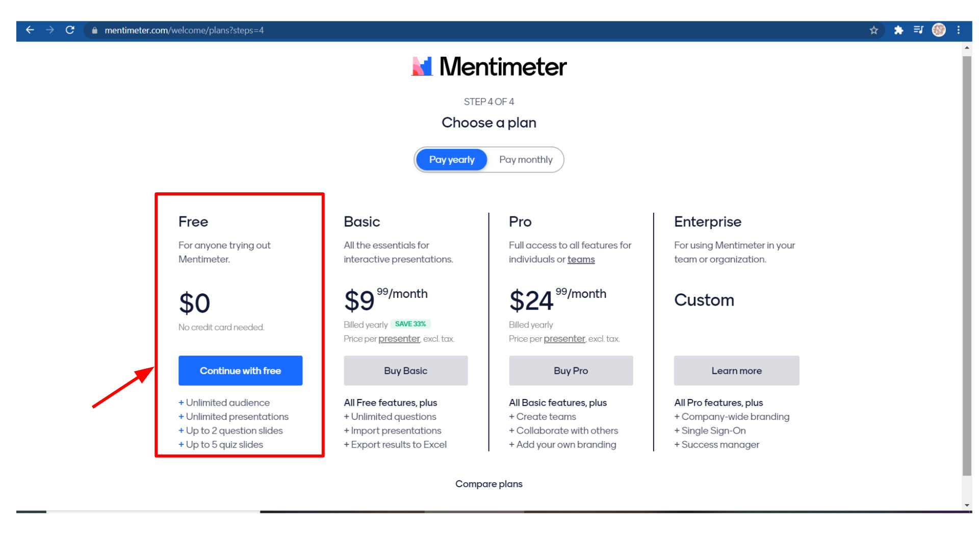 Step 4: Then they are asking us to choose a plan. There are four types of plans: free, basic, pro, and enterprise.