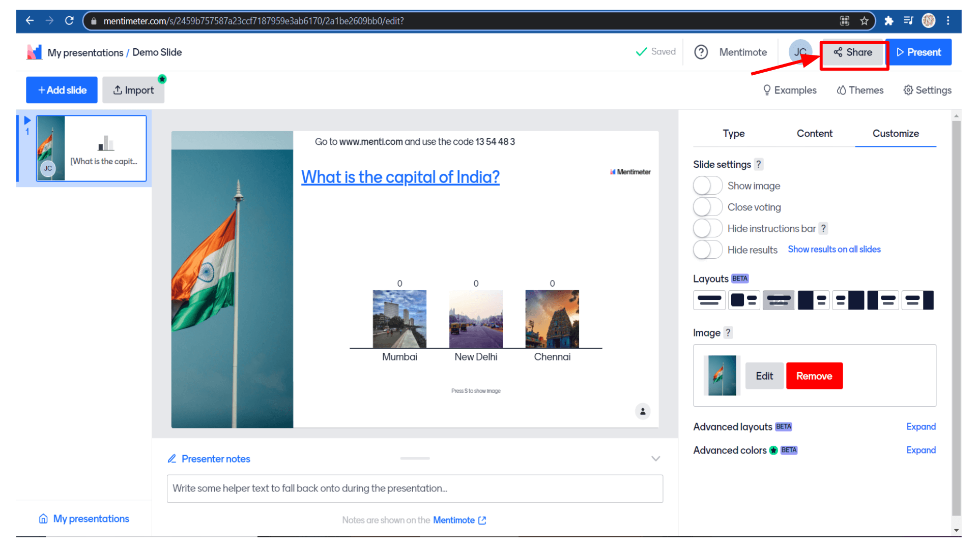 Once your presentation slides are ready you can share the slide with your students. For that click on the “share” button.